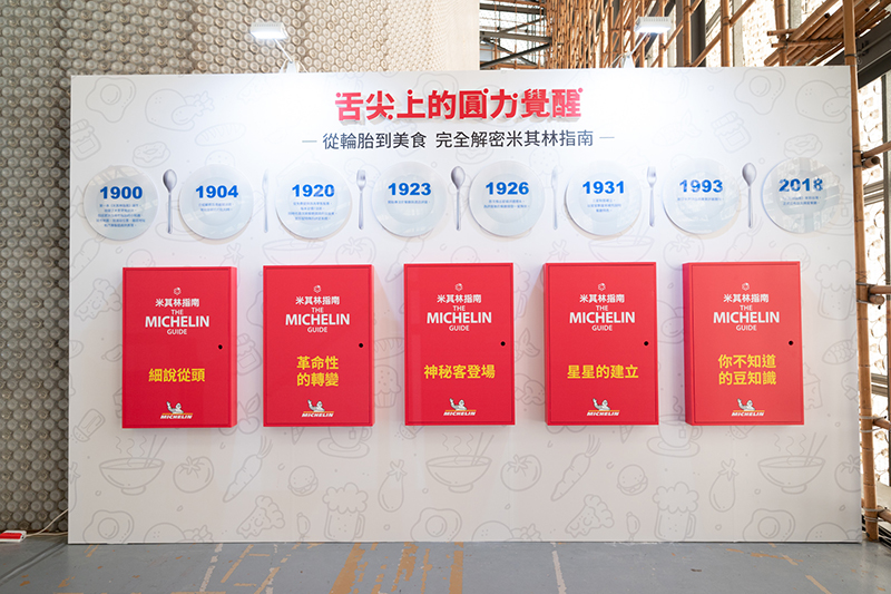 • 米其林指南 & 米其林寶寶收藏展: 該展區包含米其林大世紀、米其林博物館,收錄了1891年第一個現代輪胎的誕生,以及其他眾多事蹟,還有不同年代時空背景下的米其林寶寶,觀眾可一窺米其林的世界潮流和許多具有歷史性意義的周邊珍藏;另一個重頭戲,則是風靡世界的米其林指南,探討最初的構想是為了鼓勵更多的駕駛者出遊的初心,沒想到意外發展成享譽國際的美食評鑑。台灣從2018年啟動了摘星計畫,創造出台灣美食界的摘星潮流,促進產業進步、也活絡地方觀光經濟。