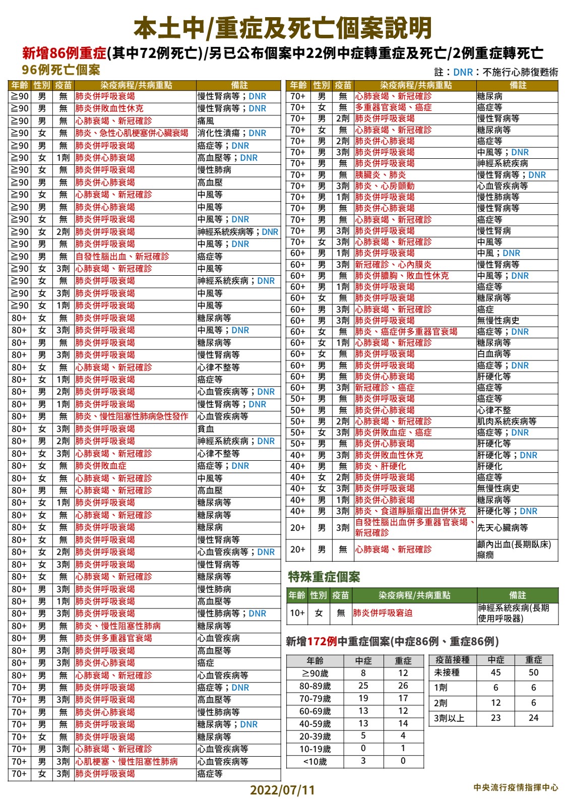 指揮中心指出,今日新增96例本土病例死亡個案,為59例男性、37例女性,年齡介於20多歲至90多歲以上,皆屬重度感染個案、94例具慢性病史、68例未接種3劑COVID-19疫苗。確診日介於今(2022)年5月7日至7月9日,死亡日期介於5月25日至7月8日。