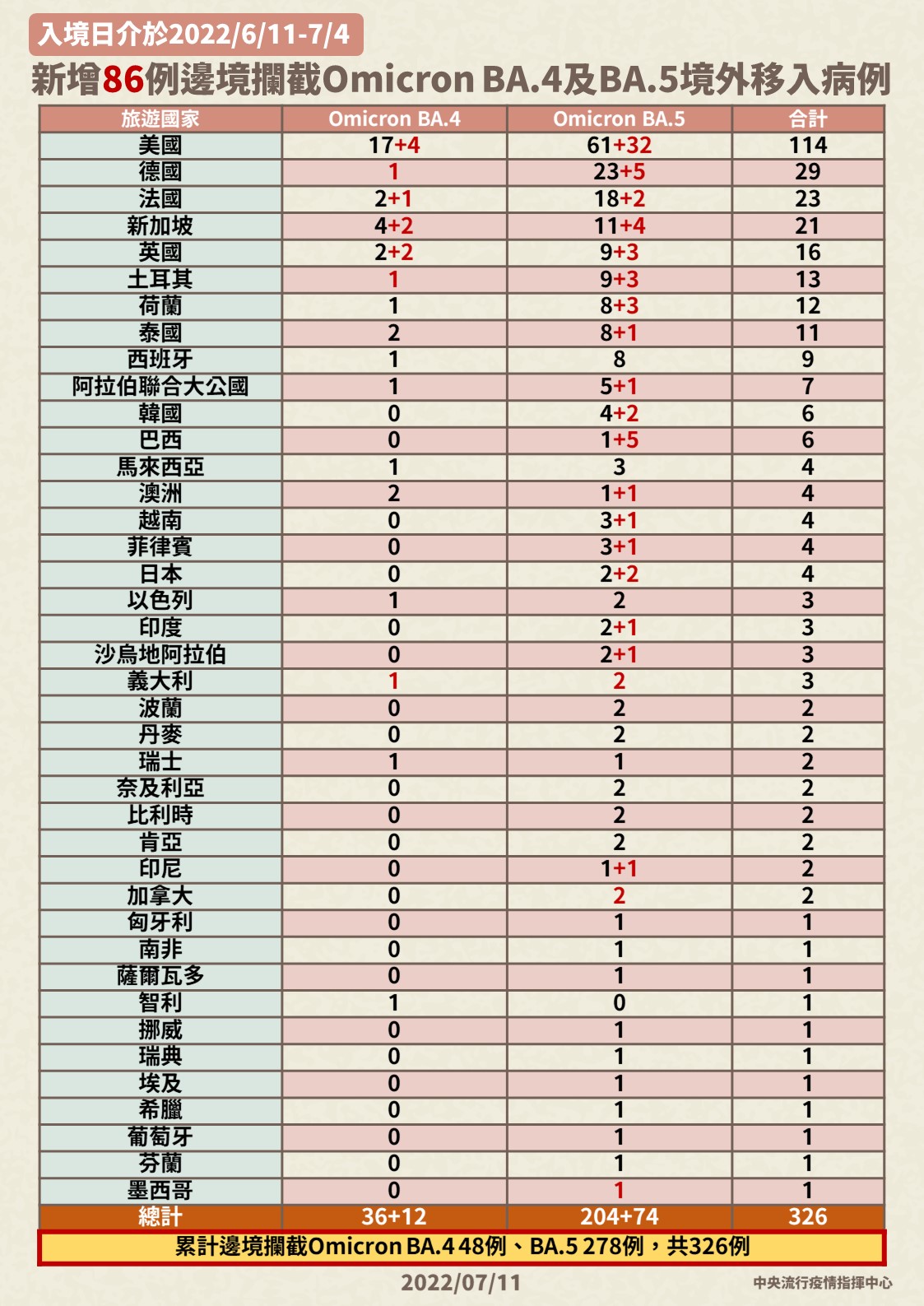 針對國內境外移入個案中新增檢出12株Omicron BA.4及74株Omicron BA.5,指揮中心表示,個案分別為50例男性、36例女性,年齡介於未滿5歲至70多歲,入境日介於今年6月11日至7月4日。其中檢出Omicron BA.4個案分別自美國(4例),新加坡及英國(各2例),德國、義大利、法國及土耳其(各1例)移入;檢出Omicron BA.5個案分別自美國(32例),德國及巴西(各5例),新加坡(4例),英國、土耳其及荷蘭(各3例),義大利、法國、日本、韓國及加拿大(各2例),越南、沙烏地阿拉伯、印度、阿拉伯聯合大公國、菲律賓、澳大利亞、墨西哥、印尼及泰國(各1例)移入。