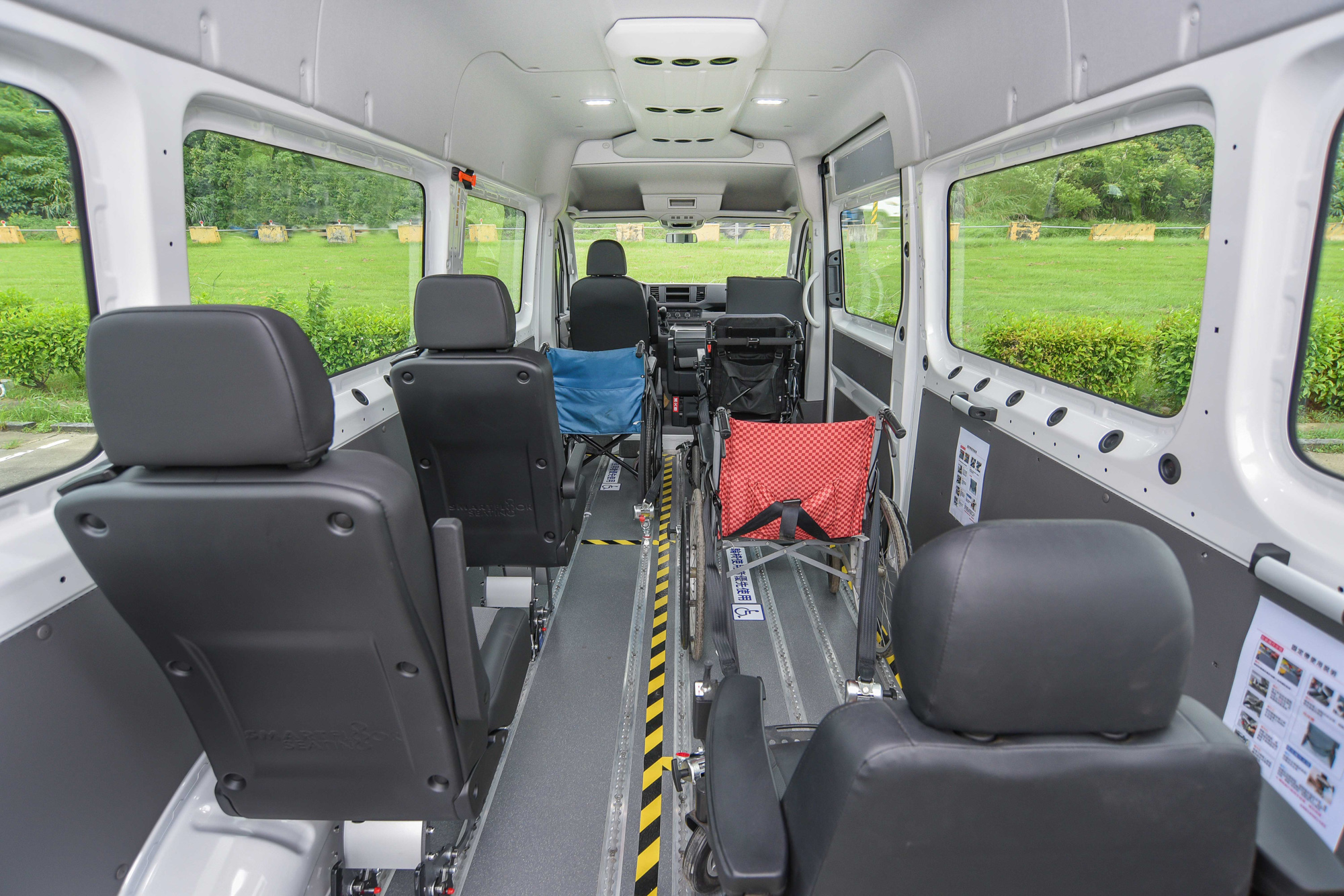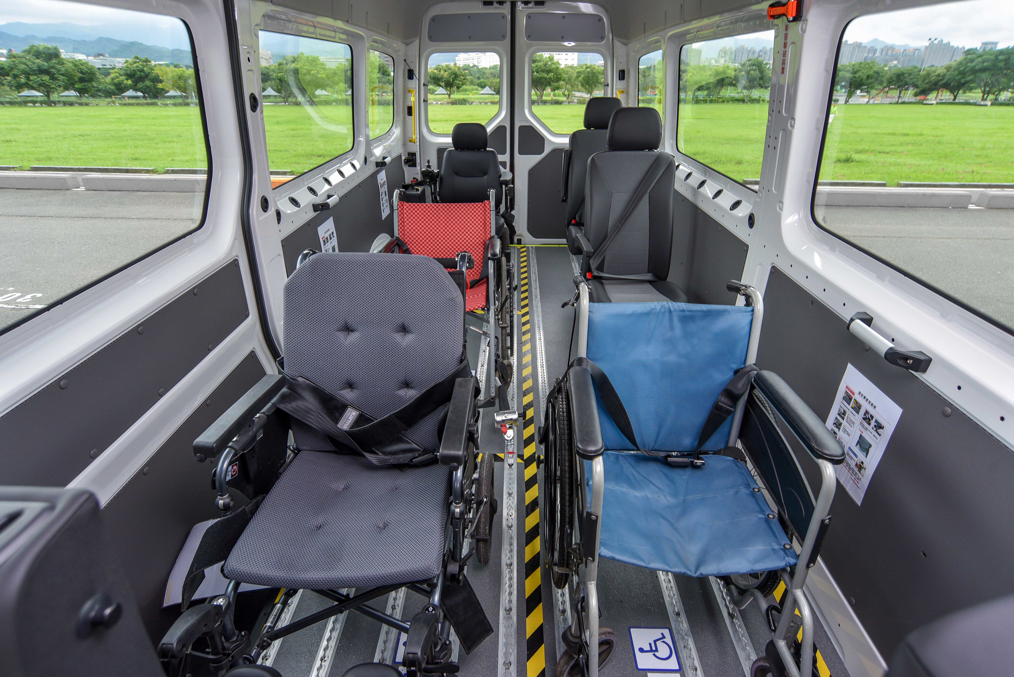 其中 5+4 隱藏式升降,即 5(一般座位)+4(輪椅數) 的座椅規劃,搭配來自於義大利的「隱藏式升降機」。安裝在車輛底盤的半自動伸縮式升降機能夠提供 350 公斤乘載能力,就算是輪椅乘客與陪伴者同時站在上面,甚至電動輪椅都能夠輕鬆應對,同時亦不會佔到車內空間。另外 8+1 鋁合金斜坡板,即 8(一般座位)+1(輪椅數)車艙規劃,搭配則是來自於瑞典的「鋁合金斜坡板」,機器重量只有 24 公斤的系統,讓使用者可以從容操作;鋁合金斜坡板最大乘載重量甚至來到 400 公斤之譜,也能夠讓電動輪椅順利通過。