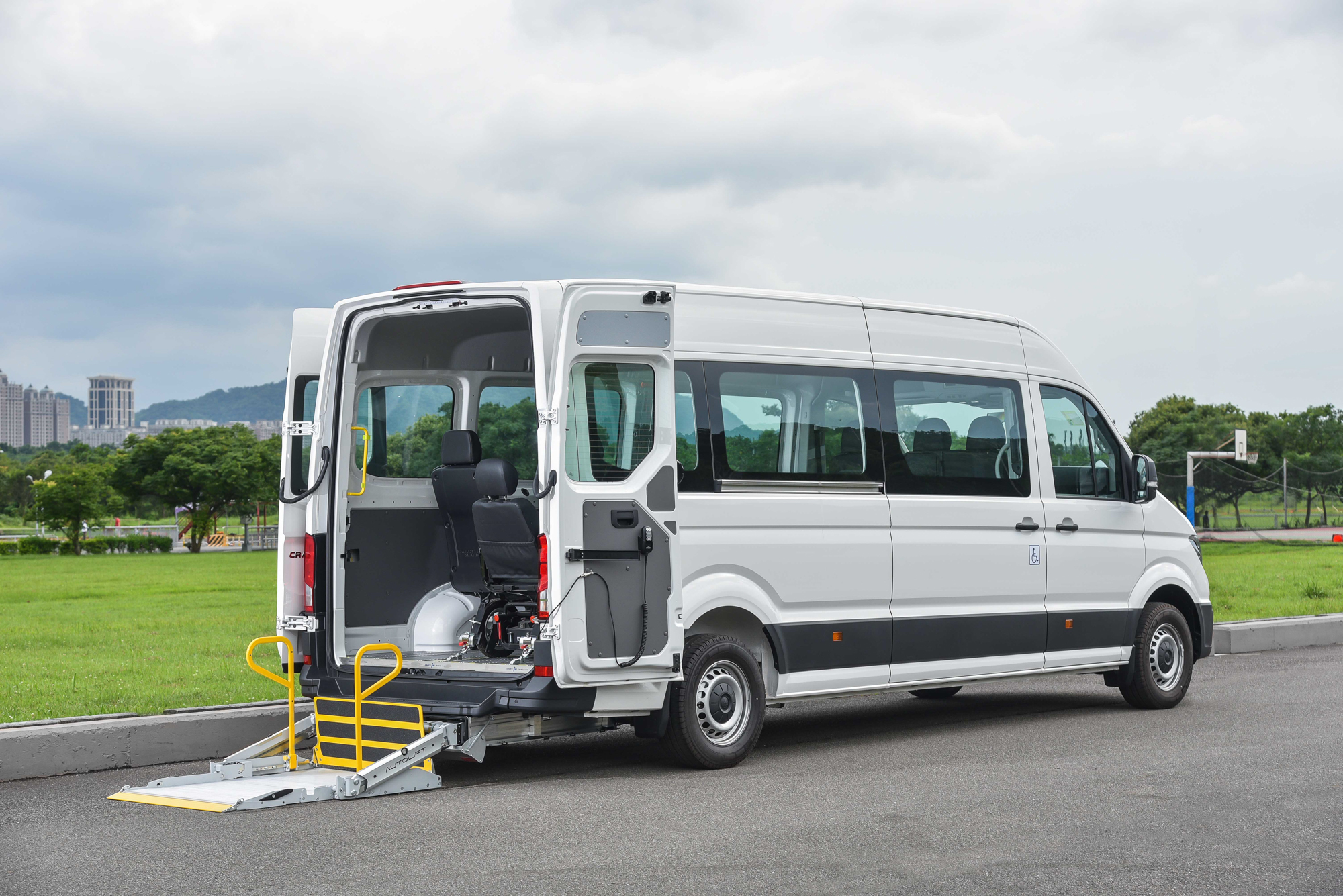 Crafter 福祉車維持 Crafter 九人座客車原有的車體基礎,長軸高頂車長 6,836mm、車寬 2,040mm、車高 2,590mm 與軸距 4,490mm 的車體尺寸;而車艙空間則最寬 1,832mm、最長 4,300mm、最高 1,961mm 都完整保留。其寬敞高挑的車內空間,讓輪椅使用者或是陪伴者皆能在車內享受舒適接駁旅程、甚至能夠輕鬆站立。