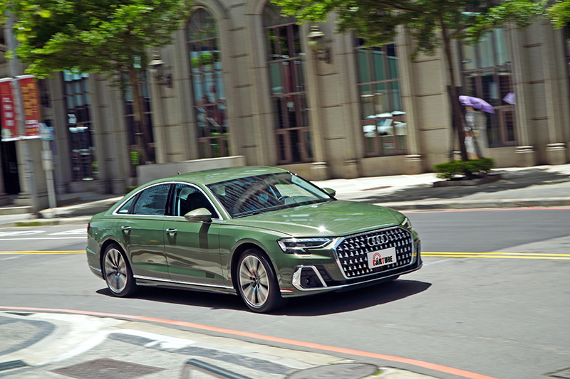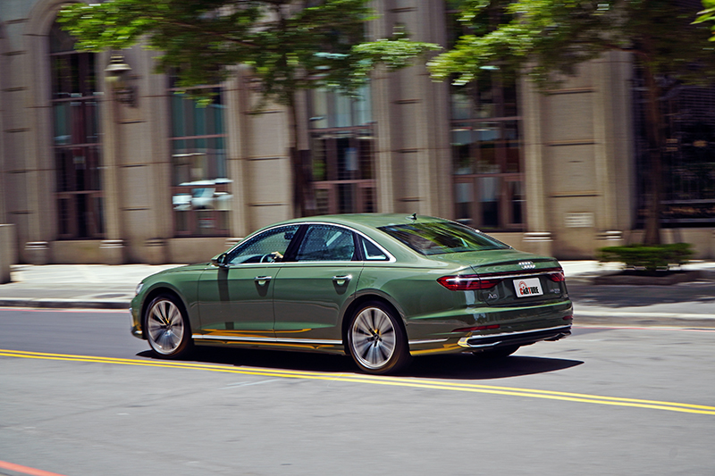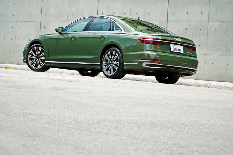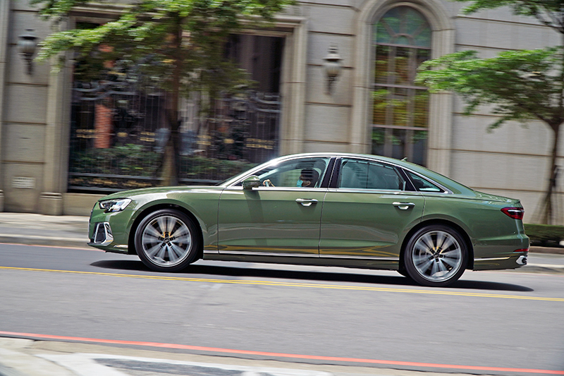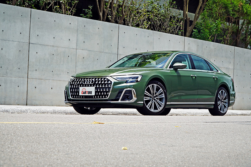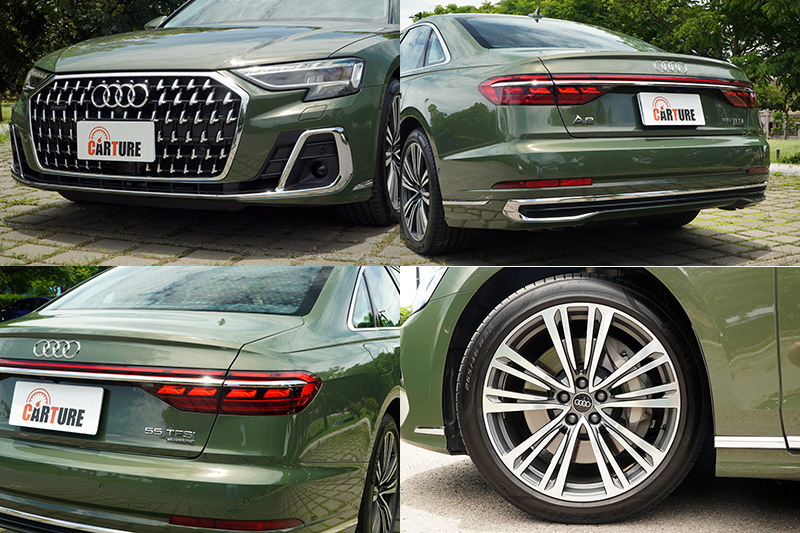 本次試駕的A8 55 TFSI quattro享譽版,是目前第四代A8的小改款後車型,標準軸設定,軸距為2,998mm;既然是偏向自駕取向,所以台灣奧迪將媒體駕車選擇了大型豪華房車較少見到的金屬軍裝綠,獨具特色,而相較於小改前,導入了全新鍍鉻翼端帆水箱護罩設計,搭配3D 立體感的前保桿、車頭鍍鉻下氣壩及車尾鍍鉻下擾流設計更顯俐落風格,另頭尾燈亦換上新式燈光造型設計,勾勒出新式運動優雅感。