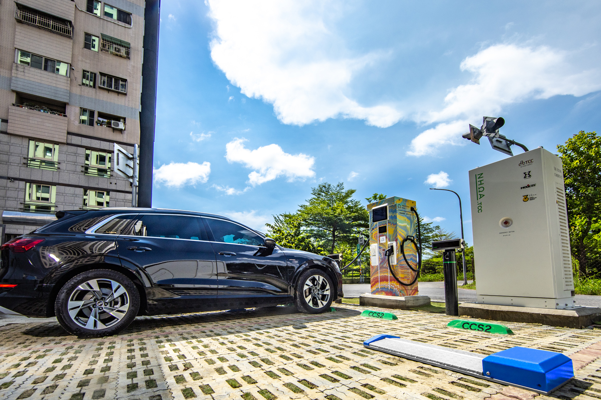 NHOA.TCC 台南亞萬站使用飛宏科技 DC 快充樁、設置1座快充樁2槍,預計提供嘉南地區上千台 CCS1 及 CCS2 規格電動車。針對電動車主擔心被油車佔位的問題,亞萬站推出車牌辨識系統,並結合智慧地鎖,讓電動車主可以安心到超商充電、休憩、購物。當電動車抵達亞萬站後,車辨系統會判斷車牌是否為電動車,然後在駛入車位時,地鎖會自動降下。也請留意,油電混合車暫時無法適用此站服務。