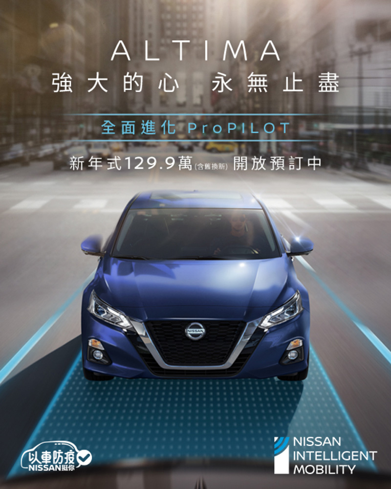 註2:「ProPILOT智駕輔助系統」及「RR-AEB後方防追撞緊急煞車系統」功能說明,請參閱Nissan官網介紹:https://new.nissan.com.tw/nissan/cars/Altima。以上所示智行科技安全系統及其他安全性系統功能可能有條件限制,且此為原廠提供參考數值,實際道路行駛時,可能會受路況、載重、風阻、輪胎狀況、個人駕駛習慣及車輛維護保養等因素影響,使實際數值產生差異。智行科技安全系統僅用於輔助駕駛者,不可替代安全駕駛操作,請確實遵守法令規定,駕駛時應保持警惕,密切留意周遭環境。