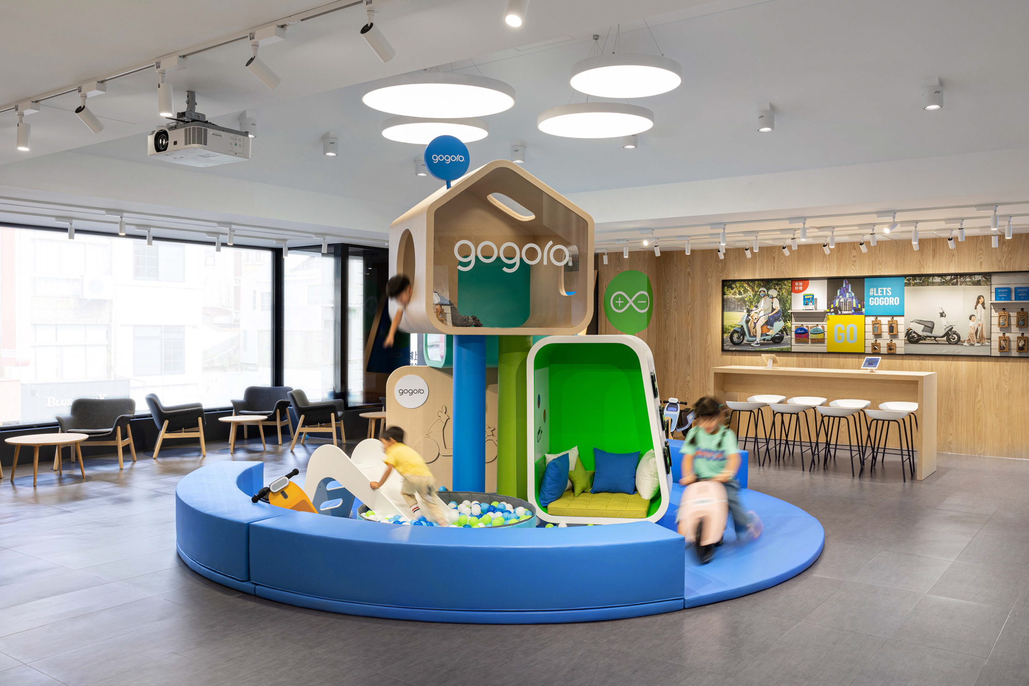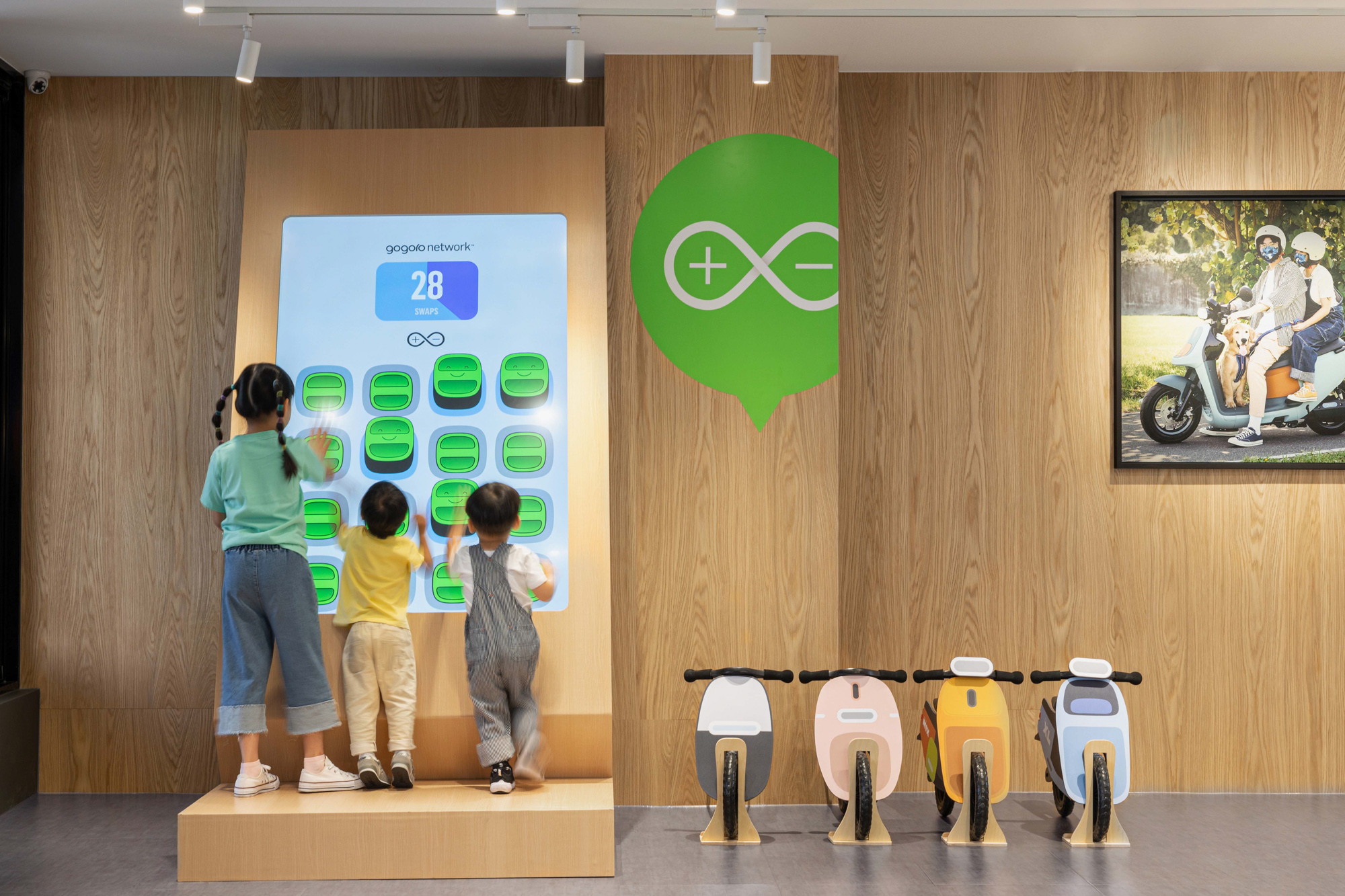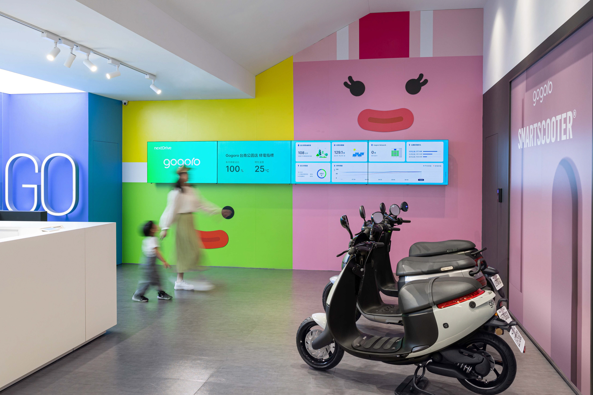 二樓則是開闊明亮的新車展示區及親子遊憩區,展示空間陳設 Gogoro 全系列車款,所有顧客都能在眾多車款中挑選出最適合自己的座駕;而根據 Gogoro 車主輪廓調查,台南市的 Gogoro 女性車主佔比高達 57%,其中包含許多親子族群,為了讓親子賞車時更加溫馨歡樂,特別打造百坪兒童遊戲親子主題區,讓小朋友開心玩樂,媽媽也能安心賞車。