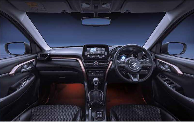 座艙中,中控台中央以V型線條將視覺集中,高規車款配有全數位儀錶、抬頭顯示器、全景式天窗、無線充電板等配備,儀錶板上缘與門識板採合成皮革包覆,有波爾多紅與黑色兩種色調可選擇,搭配對比銀色縫線提升質感,後座也配有無線充電與空調出風口,車輛也可與Maruti Suzuki開發的“Suzuki Connect” App互聯。