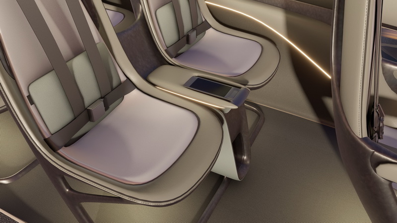 這架名為eVTOL的飛行載具在外觀上看起來類似於傳統的直升機,但由於仍在概念階段因此未安裝旋翼結構,不過從外型看去已具備相當流線的輪廓,兩側門板的開啟方式為上掀式,座艙內部包含駕駛可乘載五位乘客,尤其駕駛座椅兩側整合有操作桿使得視覺感受相當精簡,前方則為一塊提供飛行資訊的大螢幕,另外每張座椅椅背皆有一塊螢幕提供給後方乘客使用,乘客也可透過中央扶手的觸控螢幕對各項功能進行操作。