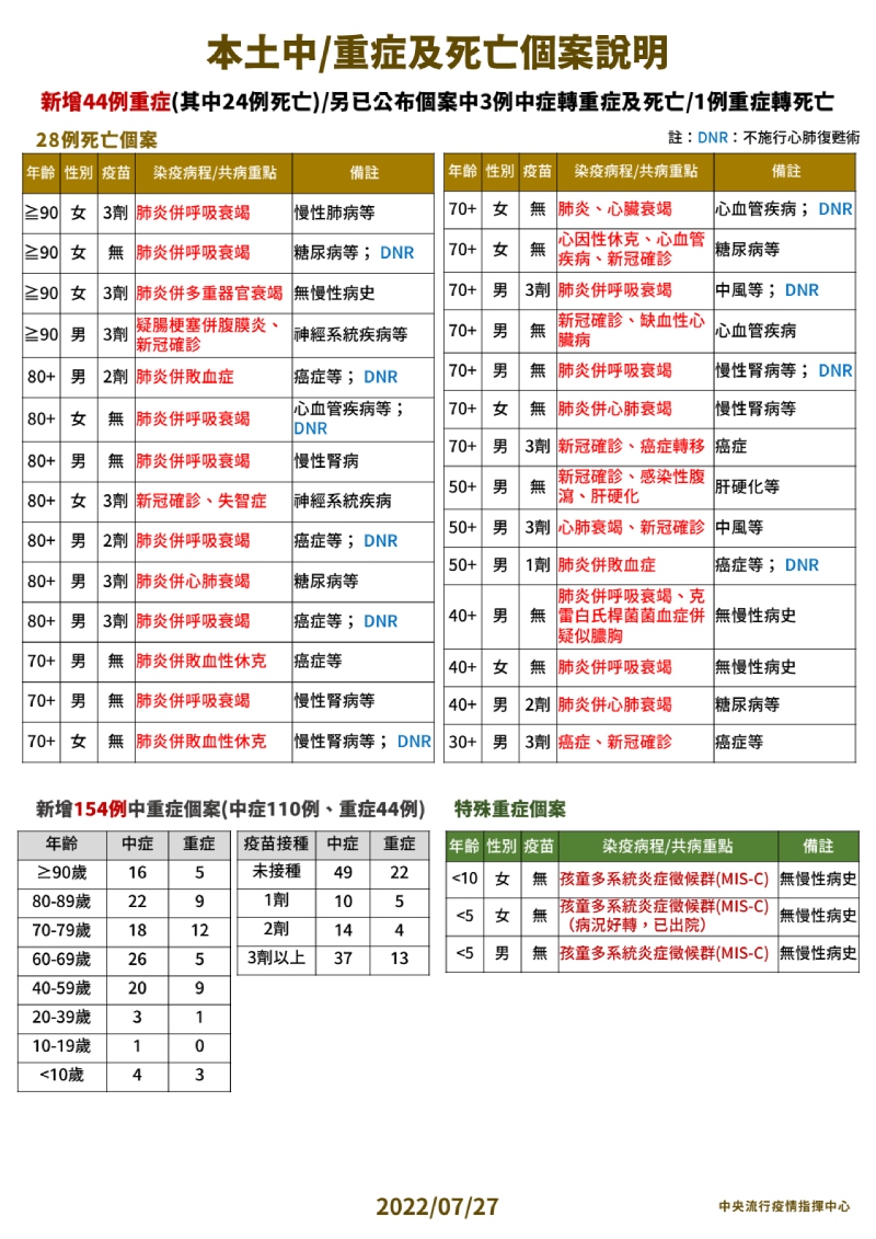 醫療應變組副組長羅一鈞表示,今日新增中症110例、重症44例,以及28例本土病例死亡個案,為18例男性、10例女性,年齡介於30多歲至90多歲以上,皆屬重度感染個案、25例具慢性病史、18例未接種3劑 COVID-19疫苗。最年輕的死亡個案為30多歲,本身有癌症病史,7/11確診入住專責病房,7/18轉到癌症安寧照護,不過後續不幸於7/24因癌症併發之問題過世。