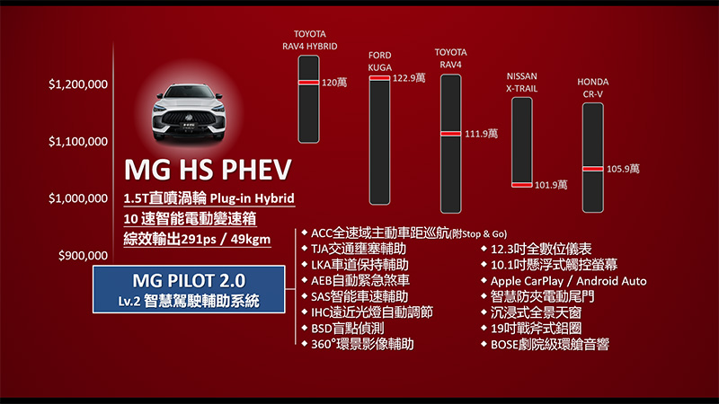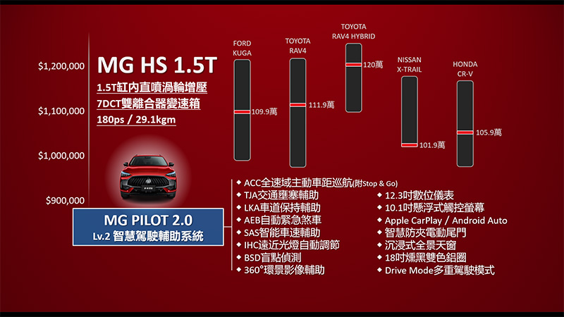 MG Taiwan看準近年持續成長的休旅車市場,以及低排量大馬力與新能源之市場潮流,在本日首度亮相在台第一款新車-當家跑格休旅HS車系,以高性價比和出眾的配備水準為訴求,分別推出百萬內超值首選「HS 1.5T」,以及國產唯一PHEV插電式混合動力「HS PHEV」兩種動力編成車款。