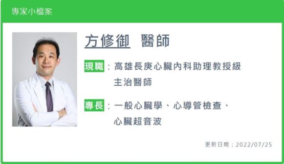 高雄長庚心臟內科助理教授級主治醫師方修御表示,新冠肺炎並非只有影響肺部,心血管疾病患者若感染肺炎將會因為缺氧或發炎影響心臟及人體血液循環系統,造成心血管疾病的惡化。根據美國一項研究統計,新冠肺炎重症患者在出院後1年內,如心肌梗塞、中風等不良心血管事件風險增加1.55倍。