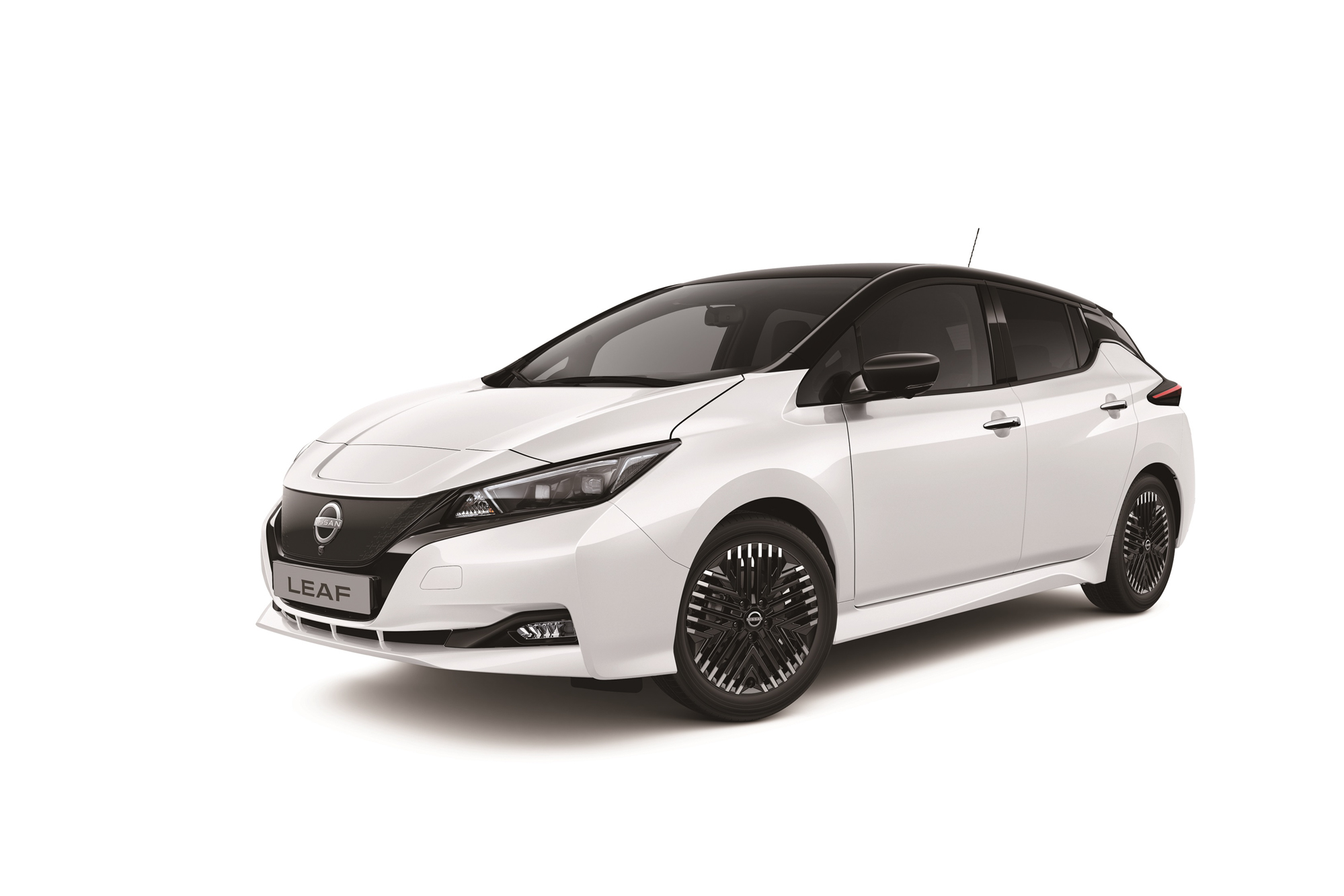 全新 2023 年式 Leaf 更全面使用 Nissan 全新廠徽,外觀採用全新設計 V-motion 黑化水箱護罩、發光式前廠徽以及全新17 吋六爪式電馭鋁圈。車色以珍珠白車身搭配淬鍊黑車頂 two-tone 設計為主,另外可以相同車價接訂生產天空藍車身搭配淬鍊黑車頂及淬鍊黑二款車色,供車主多種選擇。內裝導入高質感皮椅,附前/後加熱座椅功能。