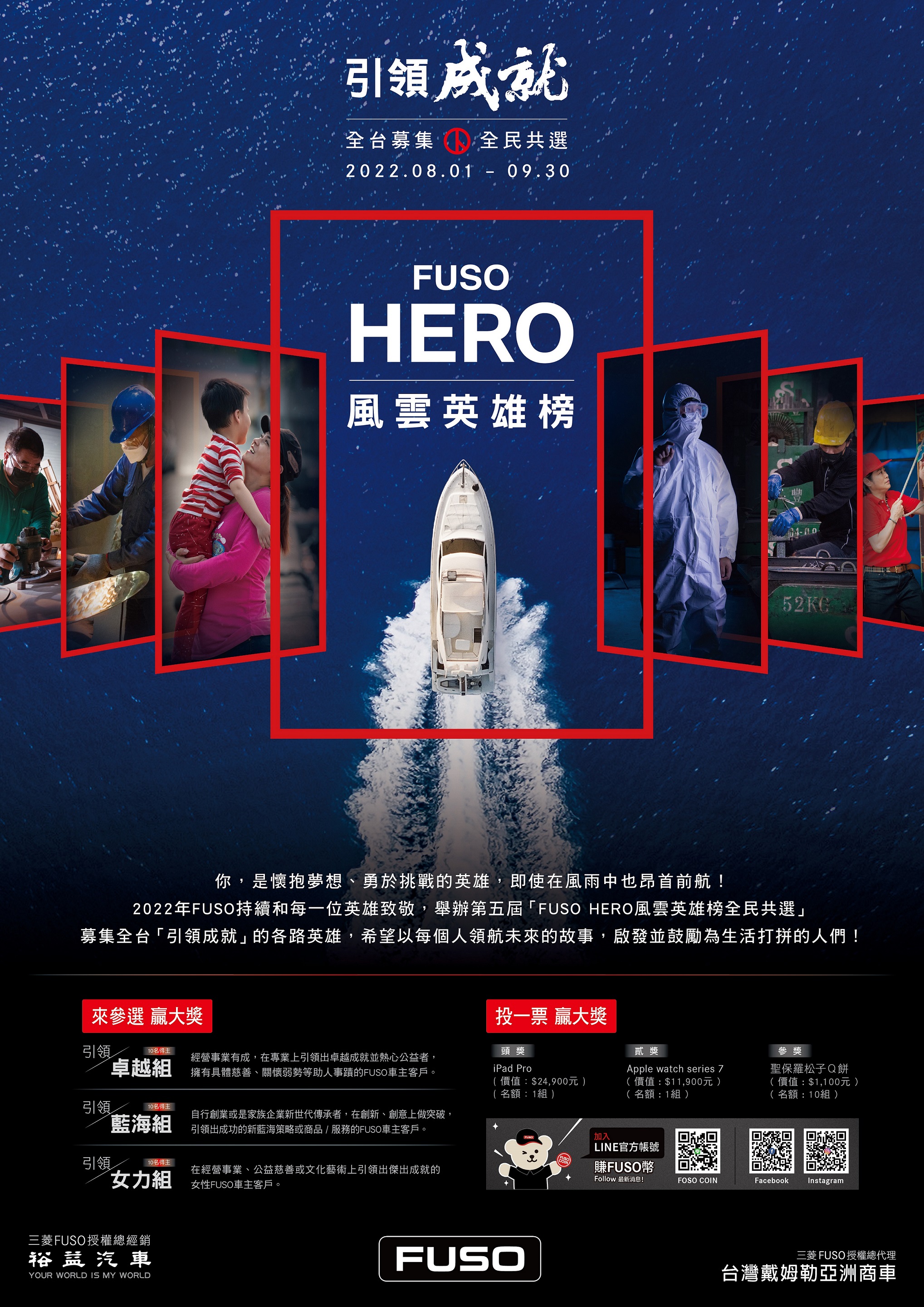 FUSO 及 Mercedes-Benz商用車總代理「台灣戴姆勒亞洲商車股份有限公司」(DTAT)自 2018 年起舉辦「FUSO HERO 風雲英雄榜全民共選活動」,至今已邁入第五年,今年(2022)活動將於 8 月初正式展開,本次共分為「引領卓越」、「引領藍海」及「引領女力」三組參選人,經由公開全民票選及專業評審團評選出今年度 FUSO HERO 得主。