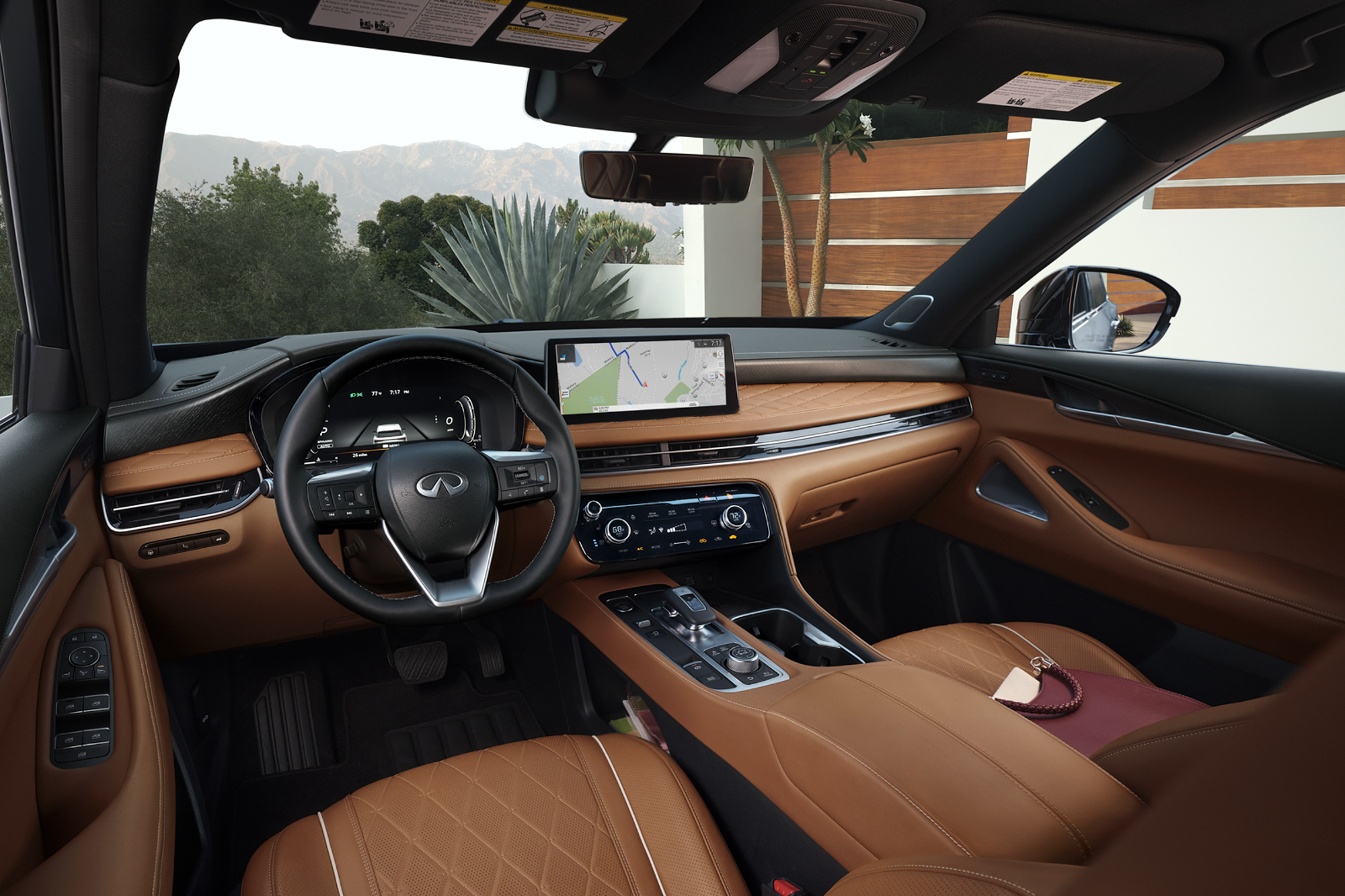 全新 Infiniti QX60 以日式設計精神展現新意,包含 LED 數位琴鍵頭尾燈與雙弓式水箱護罩、湧浪式車身設計與懸浮式車頂。內裝以皮革大面積包覆,並搭載 12.3 吋全數位儀錶板及 INFINITI InTouch™ 12.3 吋半懸浮式多媒體顯示,搭配以車室聲學分析,裝配於最佳位置的 16 具 BOSE Performance 揚聲器,更配備多達 7 個 USB 充電埠。雙前座椅具備舒壓按摩椅附通風電熱功能,3 種舒壓按摩模式。