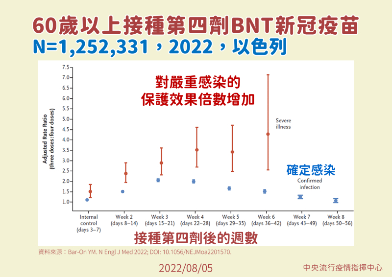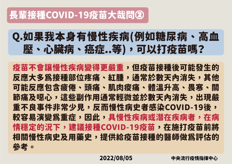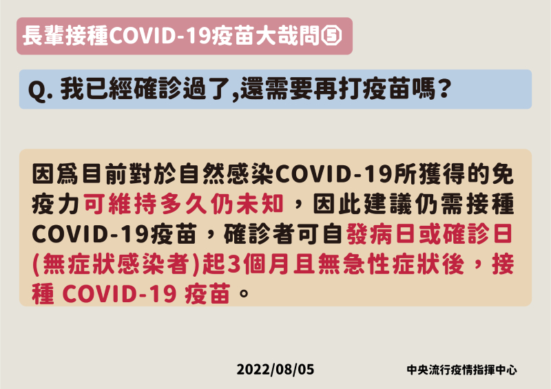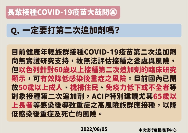 指揮中心進一步說明,根據近兩年各國於COVID-19疫情流行期間進行之相關研究,相較於未接種疫苗者,接種疫苗後確實可有效預防感染、感染後重症、住院及死亡風險,符合接種資格之民眾應儘速接種。由於COVID-19病毒不斷變異,且疫苗保護力可能隨接種時間逐續衰退,故65歲以上長者、機構住民及免疫力低下或免疫不全者應依ACIP專家建議,儘速完成疫苗接種,以降低感染後住院及重症之風險。