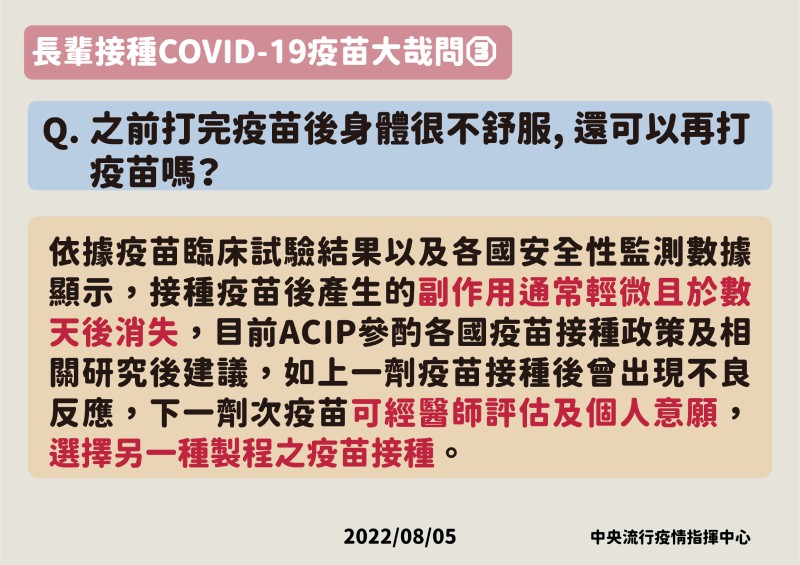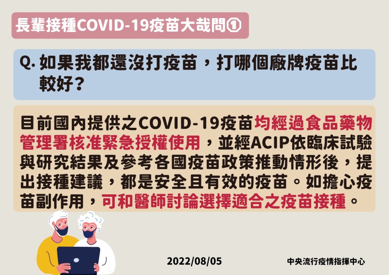 目前國內提供接種之COVID-19疫苗都是安全且有效的疫苗,均經過食品藥物管理署核准緊急授權使用,並經衛生福利部傳染病防治諮詢會預防接種組(ACIP)依臨床試驗與研究結果及參考各國疫苗政策推動情形後,始提出接種建議,請長者安心接種,擔心副作用者,可與醫師討論選擇適合疫苗接種,例次蛋白疫苗,包括 Novavax及高端疫苗。