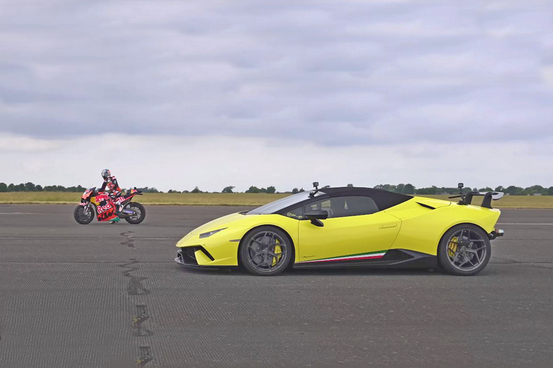 先前Porsche 918 Spyder和Red bull KTM MotoGP賽車進行直線加速挑戰,縱使有887hp但很可惜未能贏得勝利,如今Lamborghini Huracan Performante Spyder則要幫918 Spyder報仇,並且還將動力提升至1,100hp,Huracan Performante Spyder能報仇成功嗎?