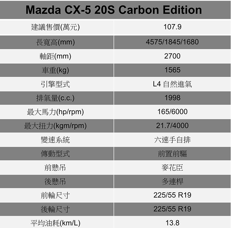 年初時我們終於等到搭載2.5升渦輪引擎的Mazda CX-5,強勁的動力表現更讓人滿意,不過在銷售面仍有許多消費者偏愛2.0升車型,如果你是務實買家,那就不能錯過此次的20S Carbon Edition。