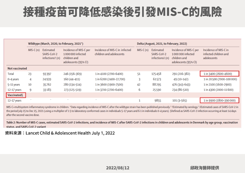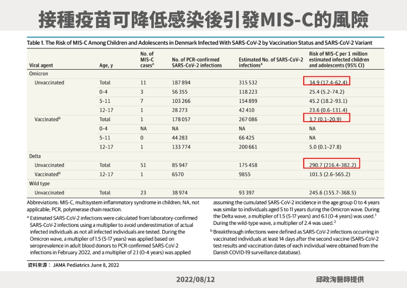 根據丹麥研究報告指出,證實接種疫苗可有效降低感染新冠病毒後MIS-C風險,邱政洵表示,丹麥統計國內發生Delta變異株流行時,相較沒有接種疫苗的兒童,「有打疫苗的族群,每1萬位,只有1位發生MIS-C。」沒有打疫苗者,「18歲以下,約3400位確診者,就有1位會發生MIS-C。」比例懸殊,也就是降低風險的保護效力可達90%以上。不僅是Delta,丹麥也統計了Omicron發生流行時,有打疫苗的兒童(18歲以下),每100萬確診,約3.7的個案有發生MIS-C,沒有打疫苗者約35位發生MIS-C。