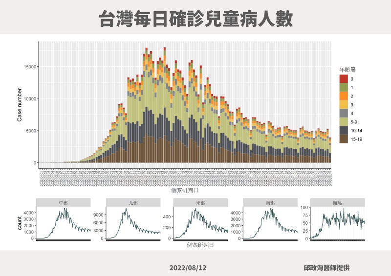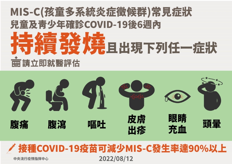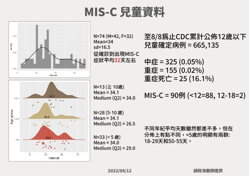 根據CDC公布,截至8/8前,12歲以下兒童確定病例,在台灣大約是66萬5000人左右,其中中症是325例,佔0.05%,重症是155例佔0.02%,重症當中有25例死亡,死亡率達到16.1%,邱政洵表示,「新冠肺炎在兒童造成的健康衝擊,不容小覷。」,其中MIS-C個案為90例,10歲以上兒童從確診到發生MIS-C,中間約隔34天(中位數)。5-10歲兒童,大約相隔26天,5歲以下則為29天,「有時候會相隔50多天到2個月,屬於晚發型的MIS-C,家長要提高警覺,而施打疫苗仍是最重要的防範措施。」
