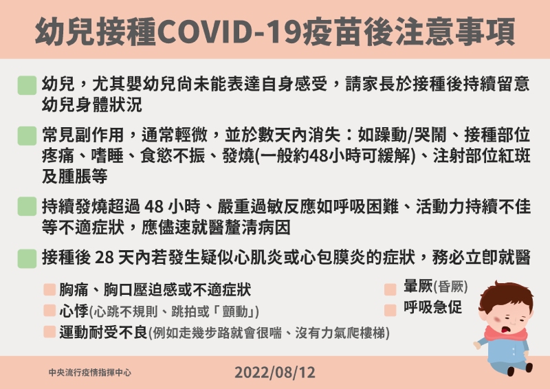 注射之後,家長應注意小朋友身上出現的副作用,「不過一般而言副作用較輕微,通常24-48小時內會緩解。」最常見情況是局部腫痛、躁動不安、嗜睡、食慾不振、發燒等。但若超過48小時,或注射之後發現嚴重過敏反應,如呼吸困難、活動力下降等症狀,應盡速就醫。另外要注意,接種後一個月是否有發生心肌炎、心包膜炎症狀,包括胸痛、昏厥、心悸、呼吸急促、運動耐受不良,比如:走幾步路就會喘。不過,這個族群發生心肌炎、心包膜炎的風險是低的。