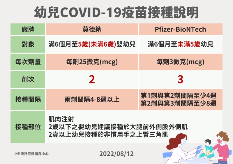 邱政洵表示,疫苗施打來預防COVID-19或是避免染疫後的併發症,已有明確的數據驗證,國內兒童施打COVID-19疫苗有兩種可選,一是莫德納疫苗,未滿六歲的嬰幼兒,每一劑施打量為5mg,兩劑之間間隔4-8週;另一則是BNT,針對6個月-5歲的嬰幼兒施打,每一劑為3mg,第一劑、第二劑間隔至少4週,第二劑、第三劑之間間隔8週。注射部位,2歲以下為大腿前外側肌肉注射,2歲以上可以非慣用手之上臂三角肌注射。