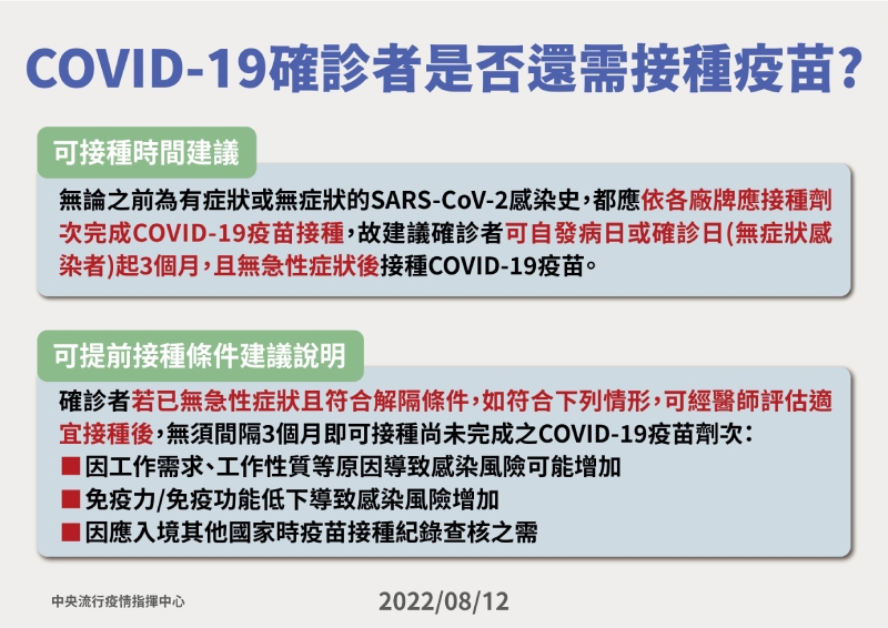 邱政洵指出,COVID-19確診者,不管是有症狀、無症狀感染者,「還是要根據你所接受的疫苗的廠牌,完整接種疫苗。」可以自發病日、確診日3個月內,沒有症狀者都可以接種COVID-19疫苗,不過在某些情況下,可以提前接種:沒有任何症狀、符合解隔條件,經醫師評估,以及特殊原因,包括工作性質非常高風險,可能再度感染,或免疫力低下族群、入境其他國家對於疫苗施打接種紀錄的要求,經醫師評估,可以提早在3個月內繼續施打COVID-19疫苗。
