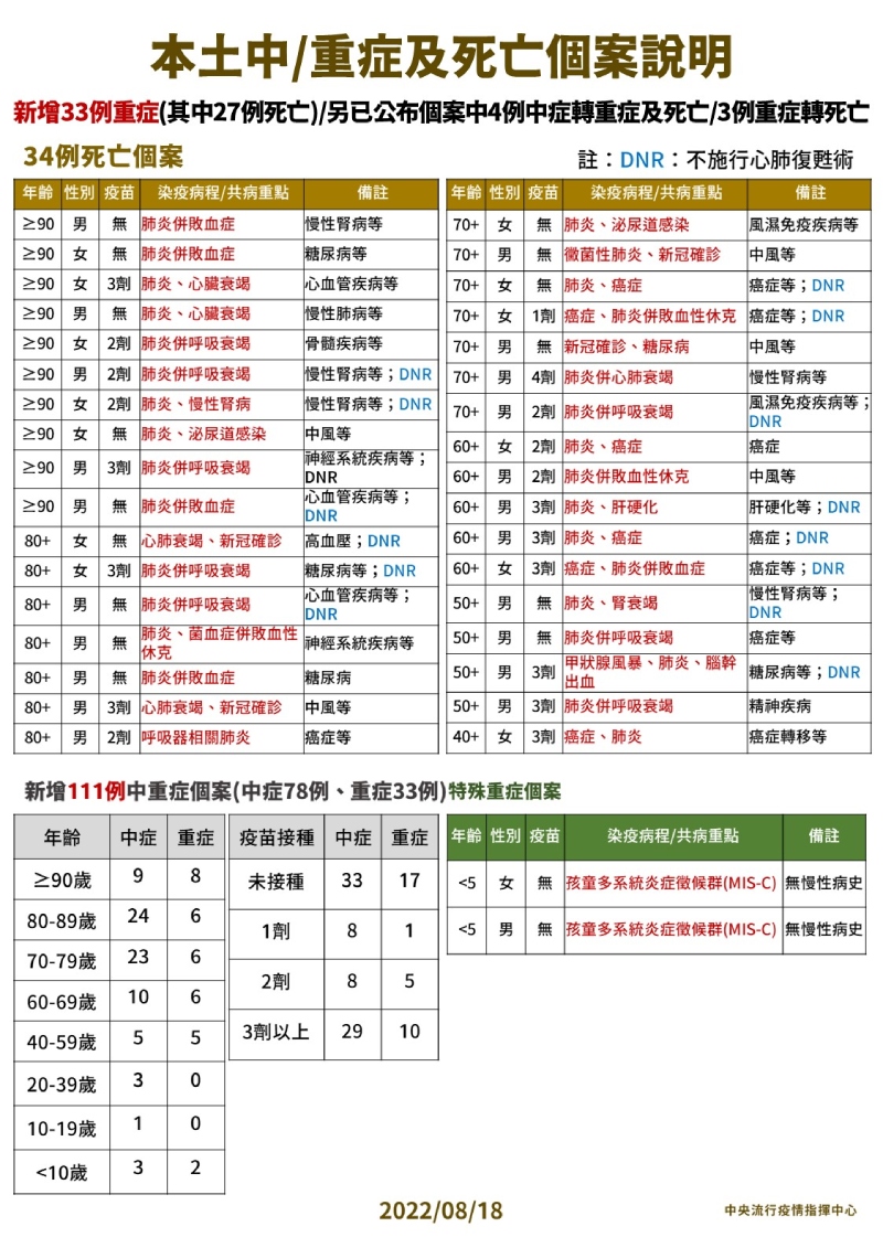 指揮中心指出,今日新增34例本土病例死亡個案,為21例男性、13例女性,年齡介於40多歲至90多歲以上,皆屬重度感染且具慢性病史、23例未接種3劑COVID-19疫苗。醫療應變組副組長羅一鈞表示,其中40多歲死亡個案是一名女性,本身有癌症轉移的病史,因有發燒、呼吸困難與嘔吐等症狀,就醫採檢PCR陽性確診,也因檢查出肺炎,因此收治於專責病房內,不過仍不幸因病情惡化,於8/13過世,死因是癌症與肺炎。