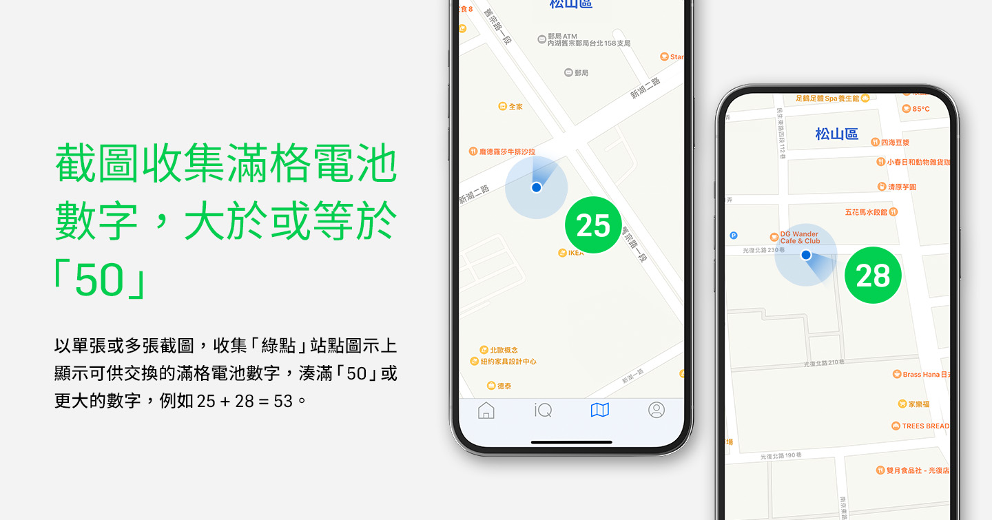 為感謝 50 萬用戶的信賴與支持,達成全體用戶超越 3.2 億顆電池交換的里程碑,Gogoro Network 特別舉辦「來電50,集綠點抽資費折抵」活動,邀請用戶於 8/24 14:00 ~ 9/25 23:59 間至全台「綠點」GoStation 交換電池,截圖該綠點站點可供交換滿格電池數字,上傳一張或加總數張截圖數字大於或等於「50」時,即可參加「每月資費現折200 元 x 連續 25 個月」抽獎,活動總計將抽出 100 位幸運 PBGN 車主。