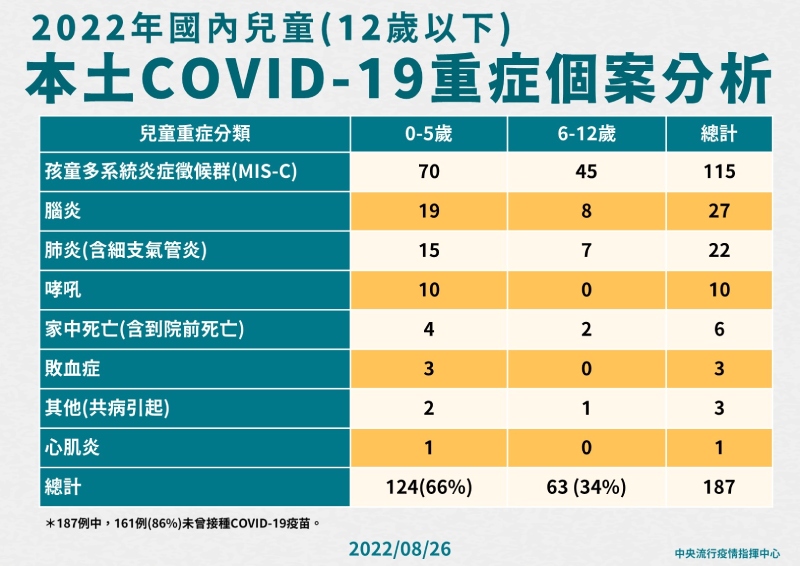 另外有3例MIS-C,皆未滿五歲。羅一鈞表示,第一位是1歲女童,本身沒有接種過新冠疫苗,7/14曾確診過,8/10開始高燒,8/12送往急診,檢查時發現有皮疹且發炎指數升高,以及凝血功能異常,懷疑為MIS-C住院,給予藥物治療後,8/19順利出院。第二位是2歲女童,5/10確診,相隔96天後,8/14開始發燒、腹痛,8/16送往急診,檢查有結膜炎、草莓舌以及血壓偏低,懷疑MIS-C而收住院,給予藥物治療後病況好轉,8/21已出院。