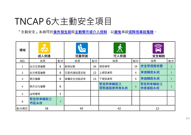 原則上,TNCAP的測試方式與評等標準是以參考Euro NCAP為主,除了每年新車銷售前八名之車系外,也會依據市場趨勢與特殊交通狀況來增加評等對象,例如目前電動車正夯,即使其銷售未達前八名,也不排除進行測試評等。