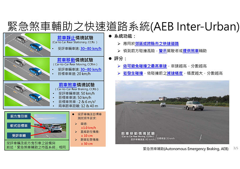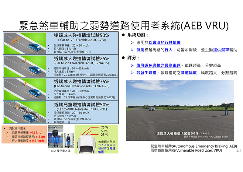 交通部說明,行政院107年核定「臺灣新車安全評等計畫(TNCAP)」,由交通部規劃分年建置臺灣新車安全評等制度,分別委託財團法人車輛研究測試中心完成臺灣新車安全評等計畫所需檢測設備、實驗室廠房採購、檢測技術建立,委託財團法人車輛安全審驗中心建置一套符合國情的臺灣新車安全評等之管理規章制度,本次落成啟用的行人安全防護檢測實驗室,即是為了執行包含頭型衝擊、上腿部衝擊及腿部衝擊等試驗,模擬車輛與行人碰撞時,車輛對行人之傷害程度,並依傷害程度轉換為星級評等,標示著車輛產業從過去注重車輛對於乘員保護之設計,轉為兼顧對外部行人保護的以人為本導向設計。而今日交通部同時執行主動安全項目之TNCAP緊急煞車輔助系統試驗及被動安全之前方全寬撞擊試驗能力展示,揭示著交通部已經完成TNCAP檢測能量建置工作,並進入營運準備階段,以達成112年第1季發布第一次評等結果。