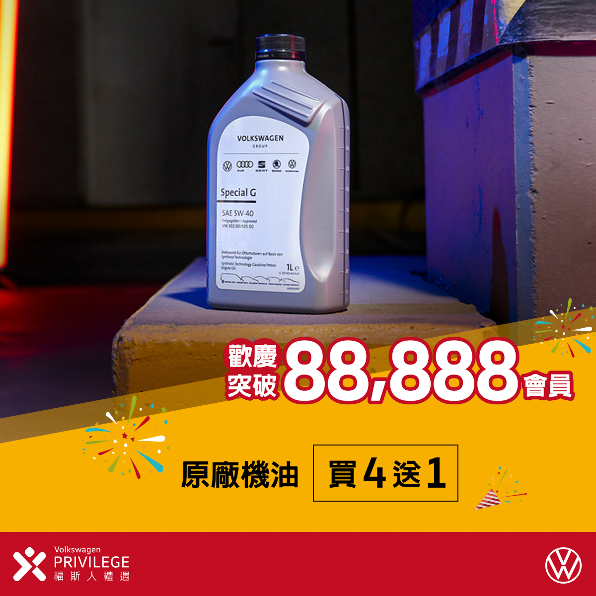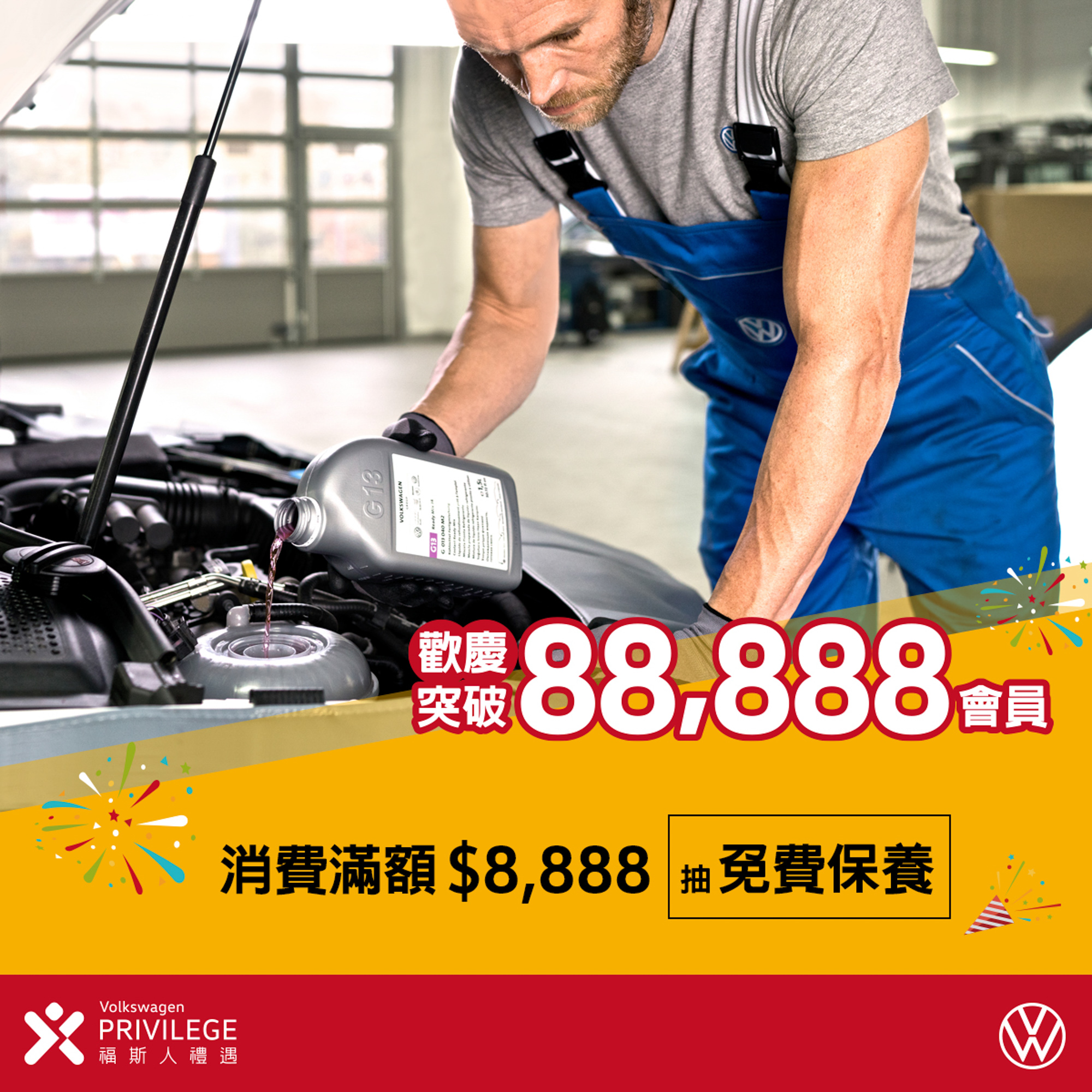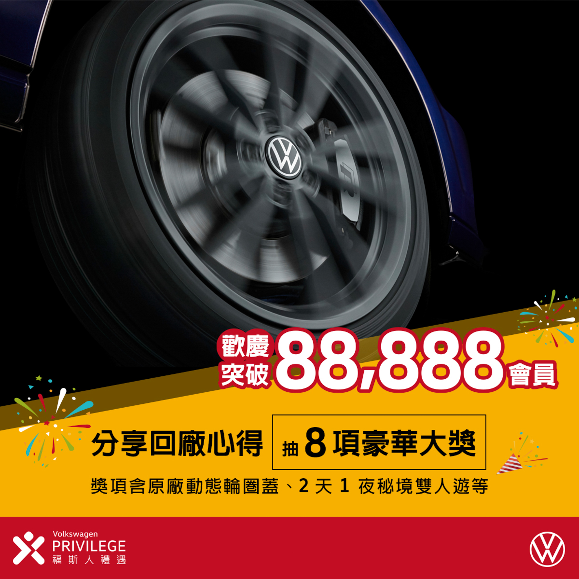 Volkswagen 歡慶「福斯人禮遇計畫」車主會員突破 88,888,特別於 9 月 1 日至 10 月 31 日展開回廠即享 8 大好禮優惠,消費滿額 8,888 可獲得*乙張「免費保養」抽獎券,滿額後每消費1,000元即可再獲乙張,以此累加,消費越多中獎機率越高。同時,車主分享回廠心得於 My Volkswagen®,並且加上指定hashtag 「#福斯人禮遇計畫」及「#歡慶突破 88888 會員」,即可抽8項豪華大獎,包括原廠動態輪圈蓋、2 天 1 夜秘境雙人遊等,眾多好禮獻給所有福斯人。