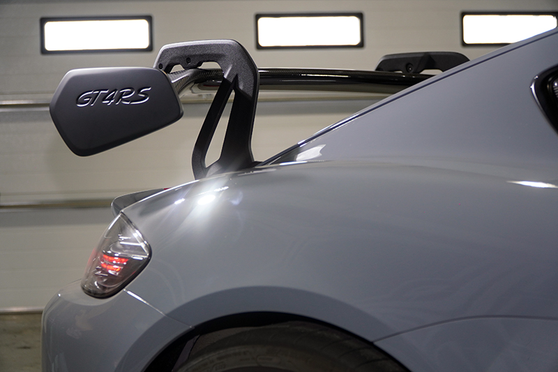 供車主選配的 Weissach 套件使得 GT4 RS 的設計更加動感。前蓋、空氣處理進氣格柵、冷卻進氣格柵、引擎外罩、外側後視鏡上方飾板和尾翼均採用碳纖維細節裝飾。其鈦合金排氣管設計向經典賽車保時捷 935 致敬,座椅後方的防滾架也同為鈦合金製。儀錶板上方採用真皮內裝套件搭配 Race-Tex 材質製成,並鑲上大型Porsche字樣。除了原本的鋁合金輪圈,Weissach 套件另可加價提供 20 吋鎂合金輪圈。