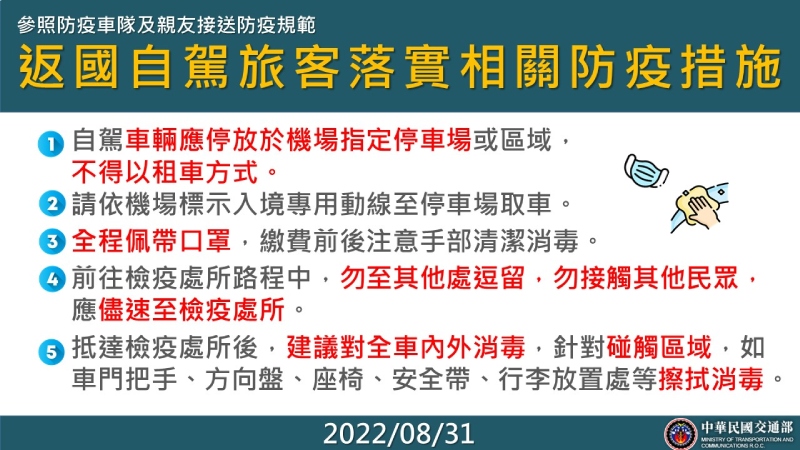 考量國人返台入境需求增加,為了提升機場服務能量,交通部民航局副局長方志文表示,9/1開始,入境旅客可以自行駕車前往檢疫處所,相關配套措施,包括機場會指定停車場和區域,例如:桃園機場、松山機場以及台東機場,都會有指定自駕車停車區域。在航廈出口處,將設置宣導告示以及發放防疫單張,並請自駕旅客依照標示動線到停車場取車。環境清消則以每架次航班結束之後,將立即清消旅客入境的動線,自駕車旅客使用之後,也會立即進行清消航廈到停車場的動線以及繳費機。