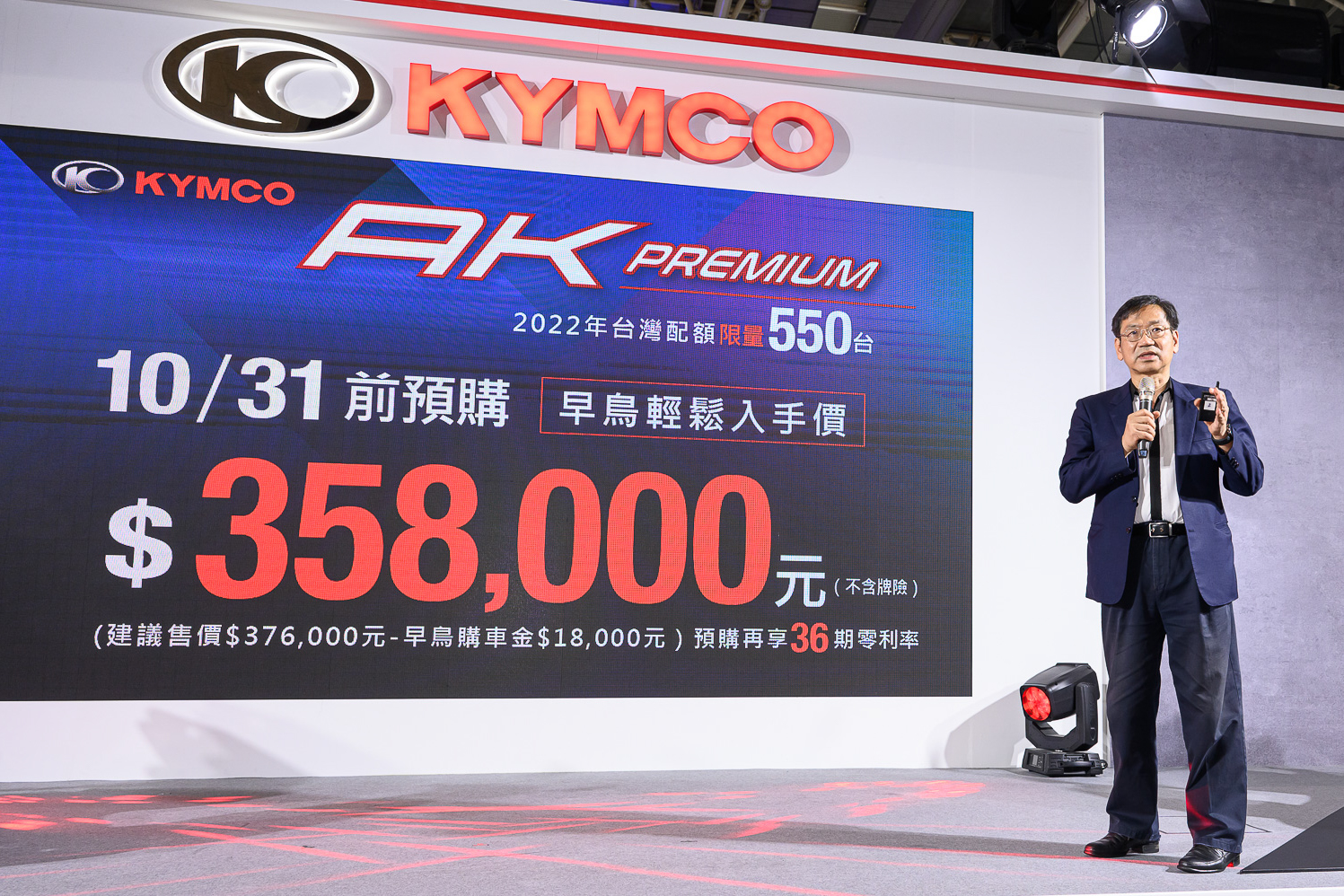 提供平光棕、靜謐藍、亮光黑三種車色選擇的AK 550 PREMIUM,因受到晶片供應限制,2022年年度配額僅550輛,建議售價為376,000元,KYMCO為慶祝AK 550 PREMIUM重磅上市,特別推出限時預購優惠,10/31前預購可享18,000元購車金 (可現折),並享專屬36期零利率,僅需358,000元就可輕鬆坐擁最強超級跑旅!
