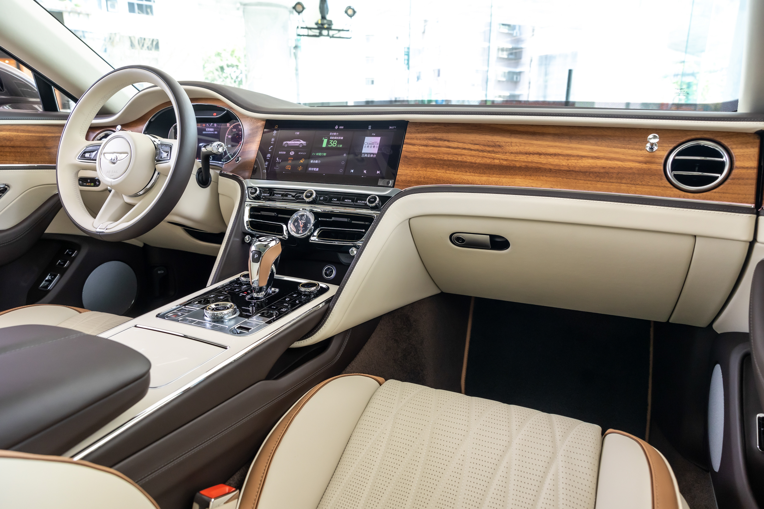 車室內,Bentley令人讚嘆的精緻工藝、典雅材質融合先驅科技,完整傳承至Hybrid車型,全新E Mode切換鈕取代了傳統的怠速啟閉開關,具備EV Drive (EV純電行駛)、Hybrid Mode (複合動力)與Hold Mode (保持電量)三種模式,駕駛可將電能動力做最有效率的安排運用,其中EV Drive (EV純電行駛)為車輛啟動時預設模式,在精緻工藝內裝之中享受純電行駛的優異感受,適合穿梭於市區及短程移動。Hybrid Mode (複合動力)則將行駛里程最大化,配合導航系統以最高效率安排所有驅動方式,甚至可設定抵達目的地時將電量耗盡;Hold Mode (保持電量)預設於Sport駕駛模式下,保留大部分電量作為動力輸出輔助,維持最佳動態表現。