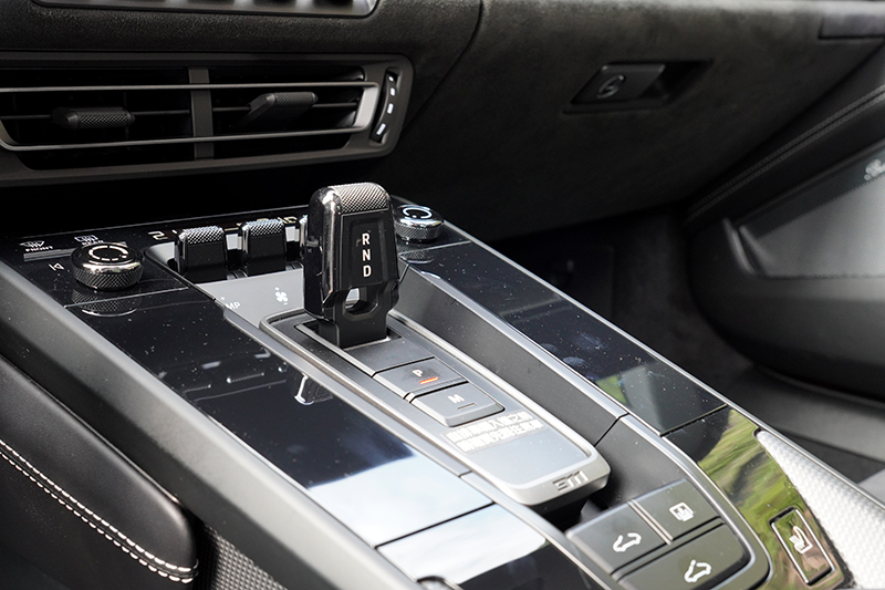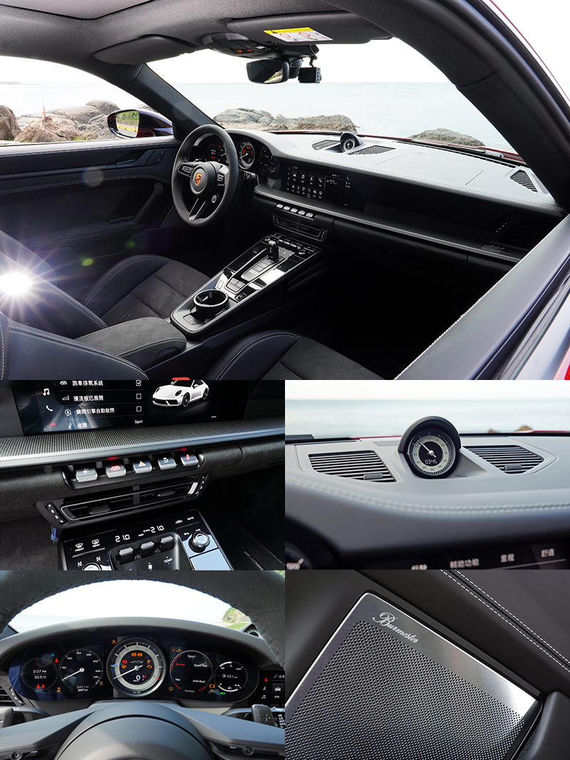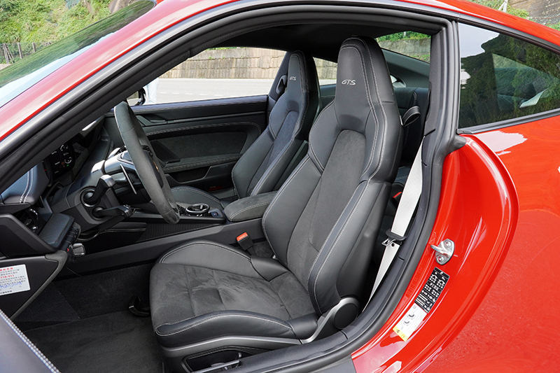 進入座艙,911 Carrera GTS大量使用Race-Tex材質,包括:中央椅面、方向盤緣、車門把手、車門板扶手、中央置物盒蓋與排檔桿皆採用了高品質微纖維材料包覆,並可以選配胭脂紅或蠟灰色縫線搭配,頭枕上則繡有GTS字樣以示身分,轉速錶以及跑車計時套件的碼錶底色時鐘皆採用相同對比色,再搭配上了霧面碳纖維飾板。