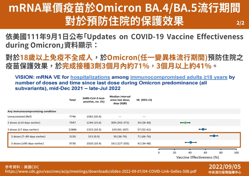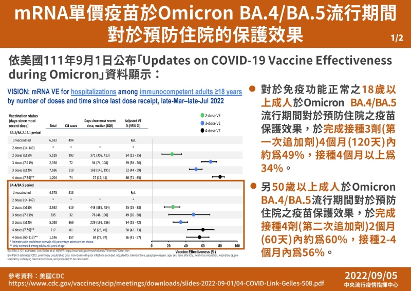 報告顯示,免疫功能正常的18歲以上成年人,在BA.4、BA.5流行期間,若有接種過三劑、四劑疫苗的對象,其預防住院(重症)的效果,在完成三劑接種者,4個月內保護效果為49%,4個月以上則為34%;而第四劑,主要對象為50歲以上成年人,對於BA.4、BA.5預防住院效果為60%,接種2-4個月後為56%。張上淳教授表示,其保護效果皆相當不錯。