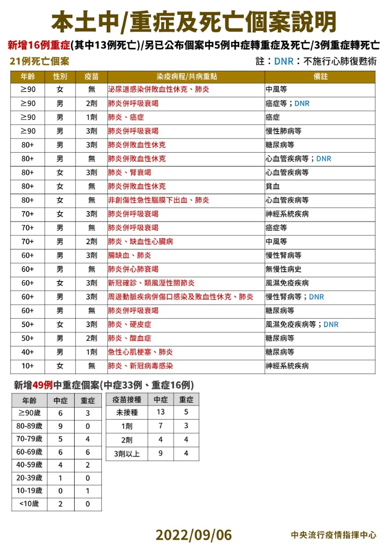指揮中心指出,今日新增21例本土病例死亡個案,為13例男性、8例女性,年齡介於10多歲至90多歲以上,皆屬重度感染、20例具慢性病史、13例未接種3劑以上COVID-19疫苗。醫療應變組副組長羅一鈞表示,死亡個案中,一名16歲女性,本身有慢性神經系統疾病且長期臥床,住在機構裡,8/22快篩陽性確診,在機構內採取居家照護,8/27發現背部有傷口,出現蜂窩性組織炎,送往醫院急診後發現有肺炎,並住院治療,但仍因病況惡化,於9/2過世。