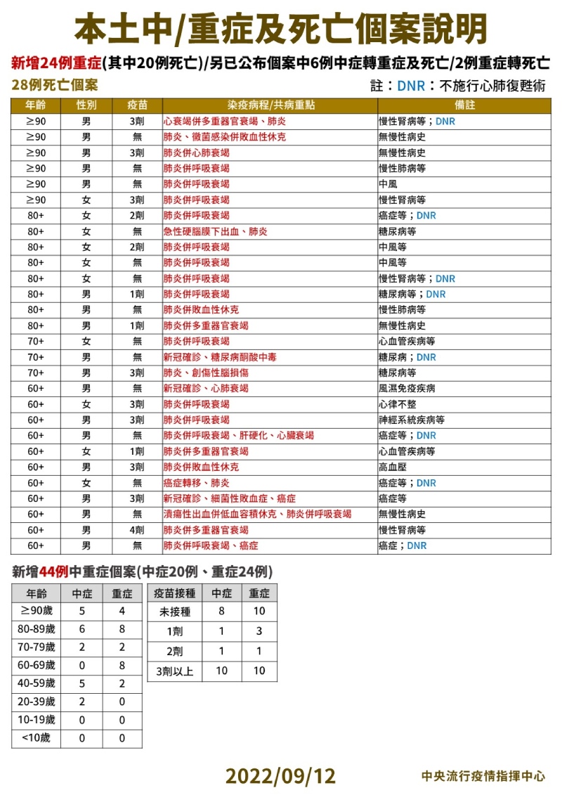 指揮中心指出,今日新增28例本土病例死亡個案,為18例男性、10例女性,年齡介於60多歲至90多歲以上,皆屬重度感染、24例具慢性病史、19例未接種3劑以上COVID-19疫苗。確診日介於今(2022)年7月26日至9月9日,死亡日期介於8月29日至9月9日,詳如新聞稿附件。