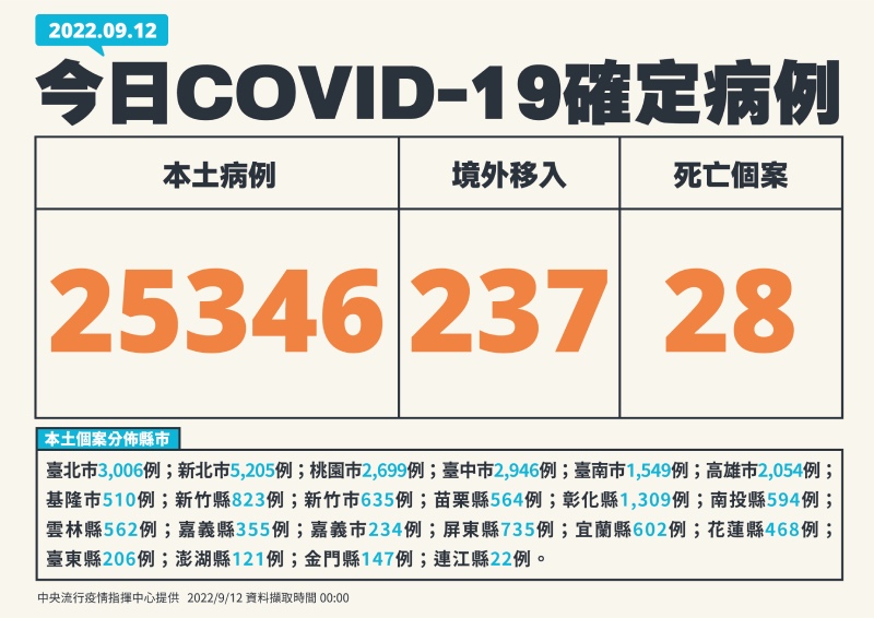【健康醫療網/記者楊艾庭報導】中央流行疫情指揮中心今(12)日公布國內新增25,583例COVID-19確定病例,分別為25,346例本土個案及237例境外移入;另確診個案中新增28例死亡。