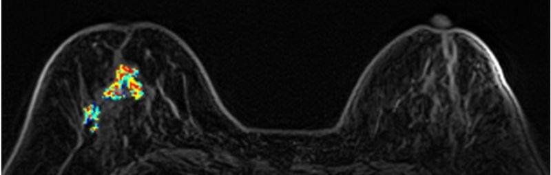 64歲石小姐,曾接受矽膠注射隆乳,因右乳疼痛求診,但矽膠在乳房攝影及超音波下會遮蔽病灶而無法診斷,經磁振造影MRI發現:右乳有一不規則腫塊(約55mm)、乳頭內縮,高度懷疑惡性腫瘤,經手術證實為乳癌。