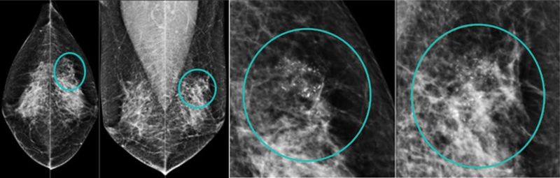 56歲王小姐,在國健署免費乳房攝影篩檢後發現:左乳房外上方有一群聚微鈣化點,經手術證實為乳癌初期,後續恢復良好。