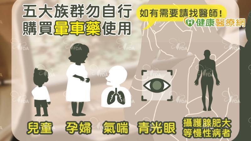 針對兒童、孕婦及本身有氣喘、青光眼或攝護腺肥大等慢性病病人,欲服用暈車藥,應先經醫師評估後開立處方並遵醫囑使用,不應自行購買服用。因為暈車藥可能引起嗜睡或注意力不集中等副作用,因此,服藥後不宜駕駛或操作危險器械。