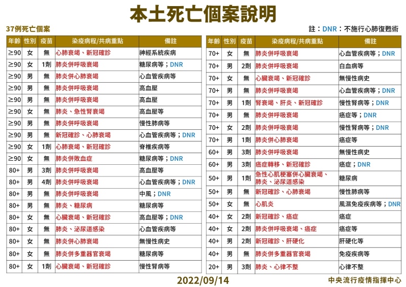 指揮中心指出,今日新增37例本土病例死亡個案,為21例男性、16例女性,年齡介於20多歲至90多歲以上,皆屬重度感染、34例具慢性病史、32例未接種3劑以上COVID-19疫苗。