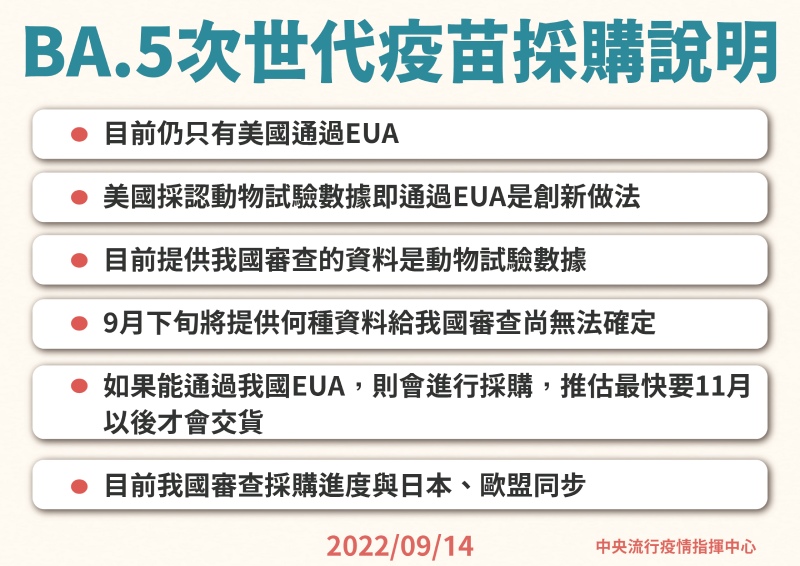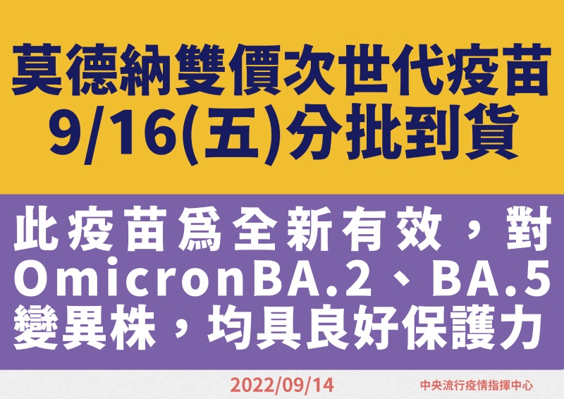 指揮官王必勝指出,莫德納雙價次世代疫苗,也就是BA.1雙價疫苗,第一批將於9/16到貨,數量約為80萬劑,將陸續再進貨。王必勝強調,次世代疫苗是一個「全新」的疫苗,對於我們社區流行的Omicron BA.2、BA.5變異株都有很好的效果,比單純打原始珠疫苗效果更好,預計本週五進行封緘檢驗,希望下週起開始施打。