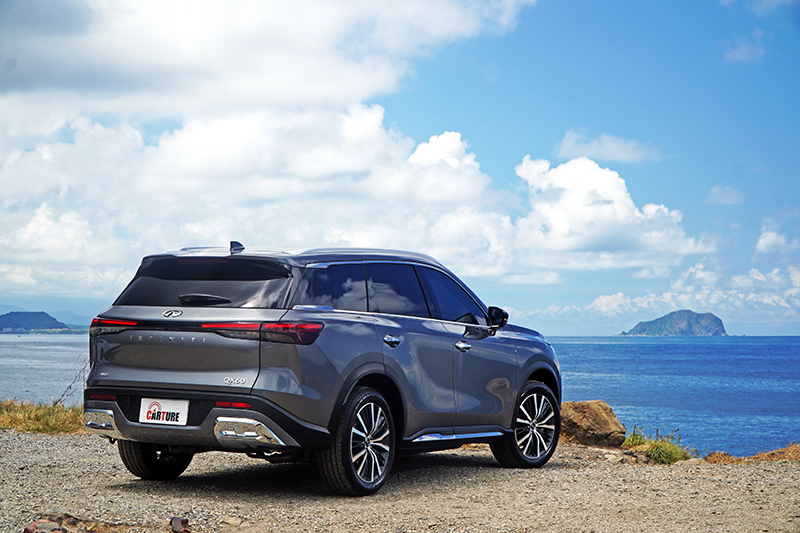 全新改款的QX60,在外觀上以簡潔俐落線條勾勒大氣典雅氣息,雙弓式水箱護罩依然是家族最顯眼的特徵,肩線自扁平銳利化的頭燈末端延伸至刀刃型尾燈,將視覺凝縮集中,讓這輛車長超過五米的大車,不會顯得擁腫,車側則以所謂的湧浪式車身曲線營造光影層次,搭配懸浮式車頂與專屬的20吋多輻式輪圈,整體造型較前代顯得精緻討喜。