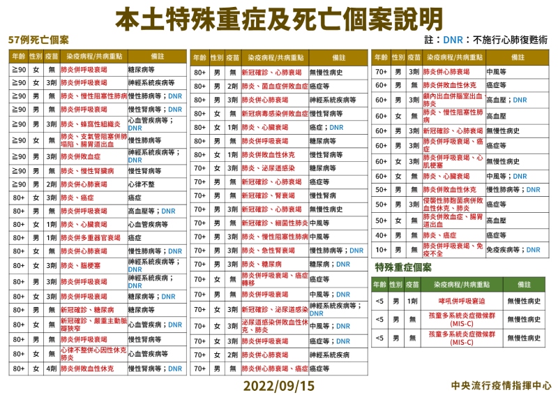 指揮中心指出,今日新增57例本土病例死亡個案,為33例男性、24例女性,年齡介於10多歲至90多歲以上,皆屬重度感染、53例具慢性病史、34例未接種3劑以上COVID-19疫苗。確診日介於今(2022)年5月19日至9月12日,死亡日期介於5月20日至9月12日,詳如新聞稿附件。