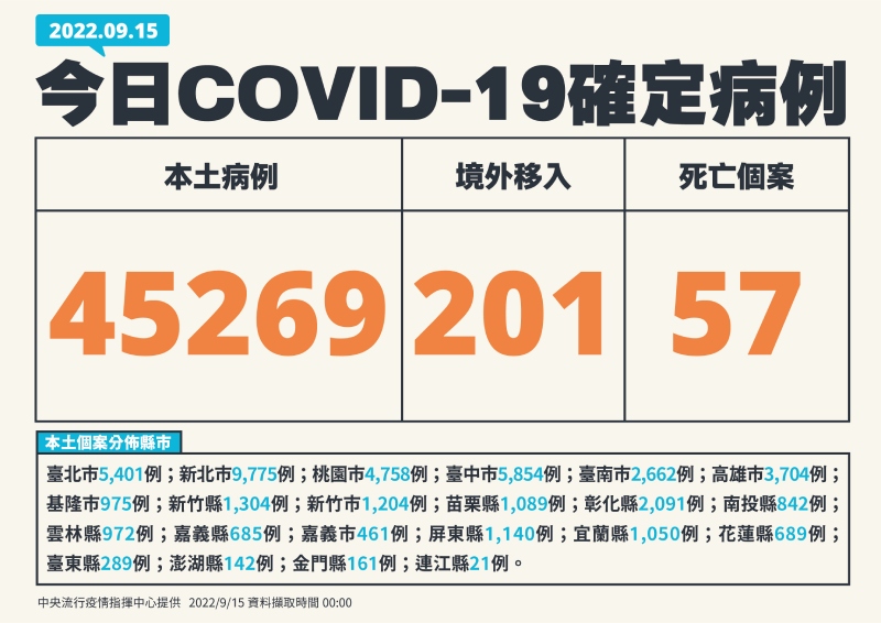 【健康醫療網/記者楊艾庭報導】中央流行疫情指揮中心今(15)日公布國內新增45,470例COVID-19確定病例,分別為45,269例本土個案及201例境外移入;另確診個案中新增57例死亡。