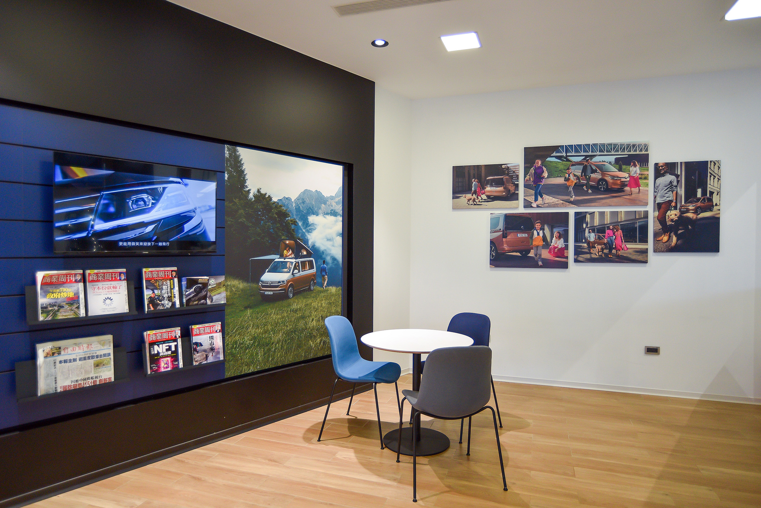 除了雙館設計,連接戶外賞車區自然綠化的設計,延伸顧客賞車環境至360度。受惠於寬敞空間,整個福斯商旅永驊汽車多達8輛福斯商旅車款可同時展示,仍保有舒適的專屬洽談區。